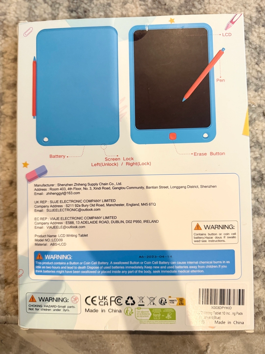 Selling a LCD Writing Tablet, perfect for children aged 3 and up! It's in great condition and comes with a pen. The tablet features a screen lock and erase button for easy use. It's lightweight and portable, making it great for travel or at home. The box is included