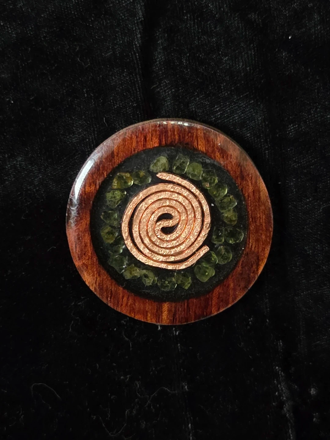Orgone energy pendant featuring a copper coil design surrounded by peridot chips. It's set in a wood and resin composite. Hand made by myself in Ontario Canada.