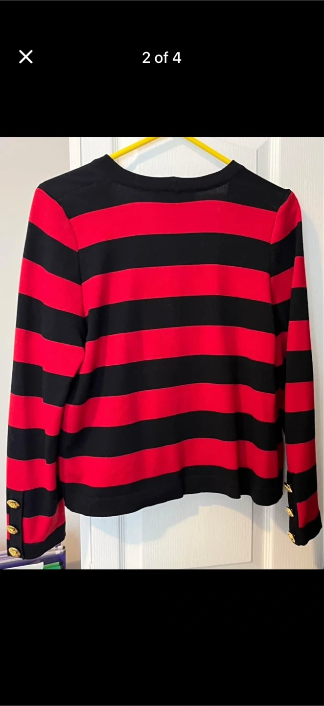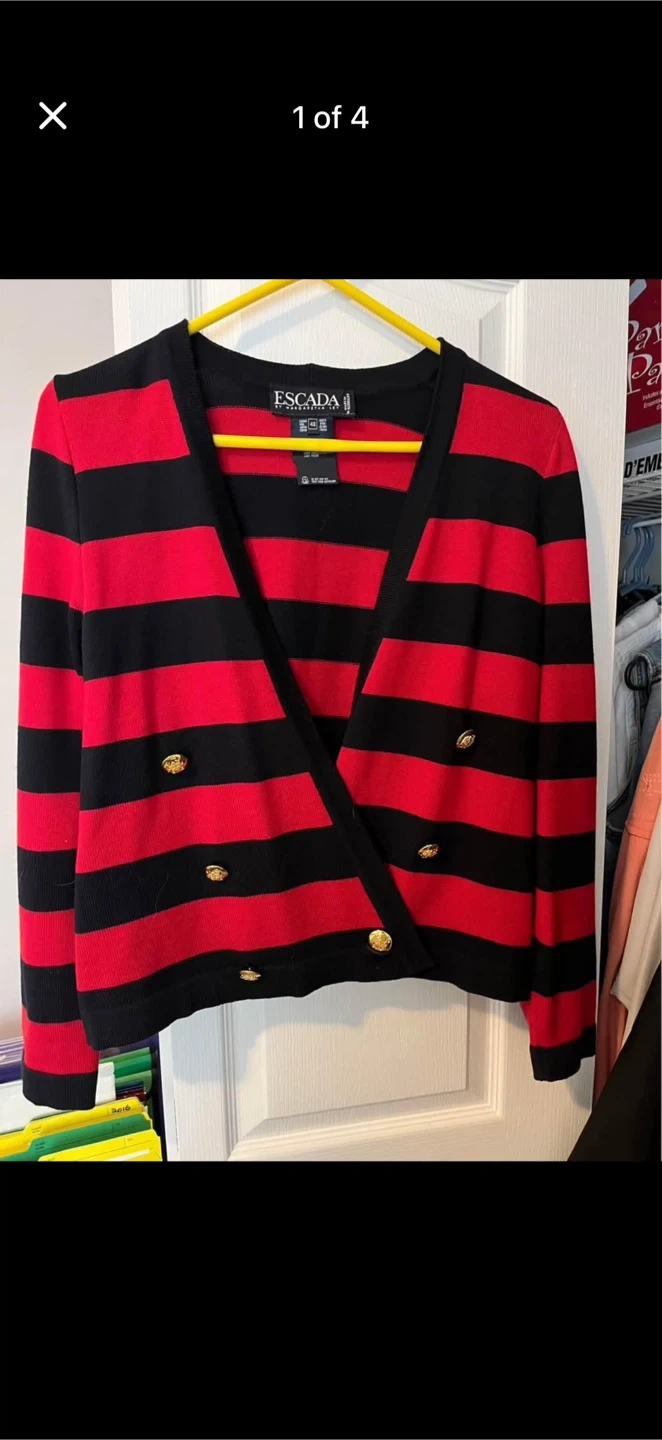 Escada by Margaretha Ley wool cardigan with a red and black stripe pattern. It features gold-tone buttons and a wrap front design. Made from 100% virgin wool. Size is 42.