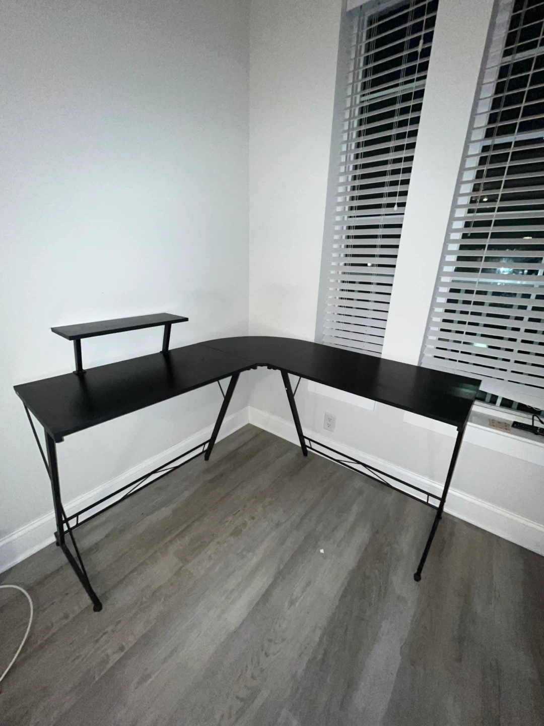 This L-shaped desk provides ample workspace with a sleek black finish. It includes a monitor stand for improved ergonomics. The metal frame ensures stability for your computer and accessories. It's a great setup for home offices or gaming stations!