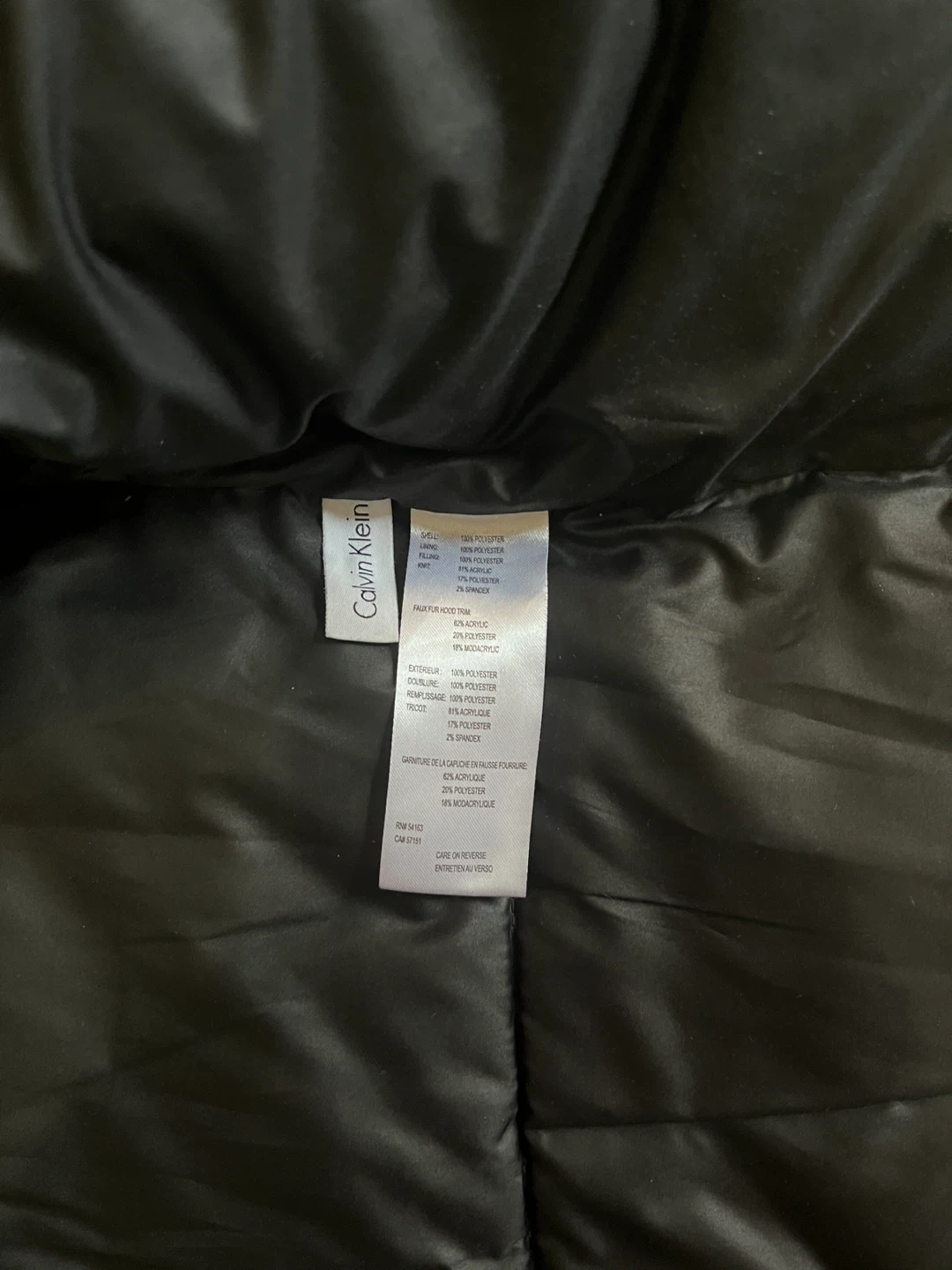 The outer shell is 100% polyester, while the lining is 100% polyester as well. The filling is 57% polyester and 43% acrylic. The faux fur hood trim is 62% acrylic, 20% modacrylic, and 18% mosaicrylic