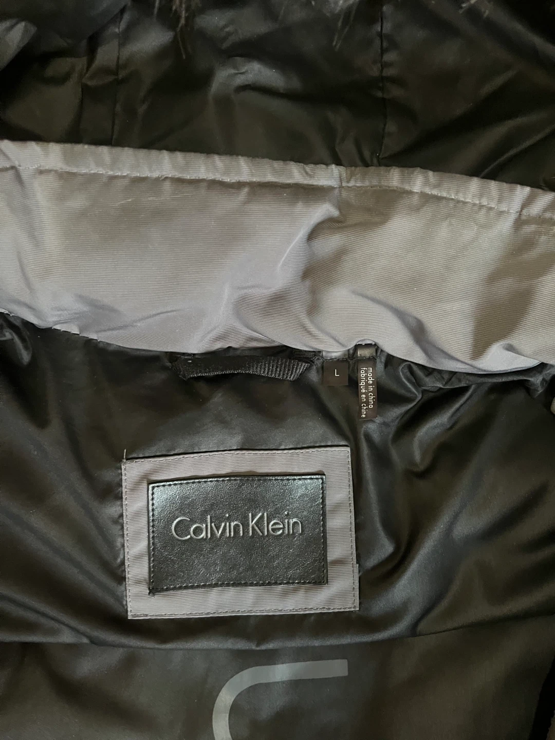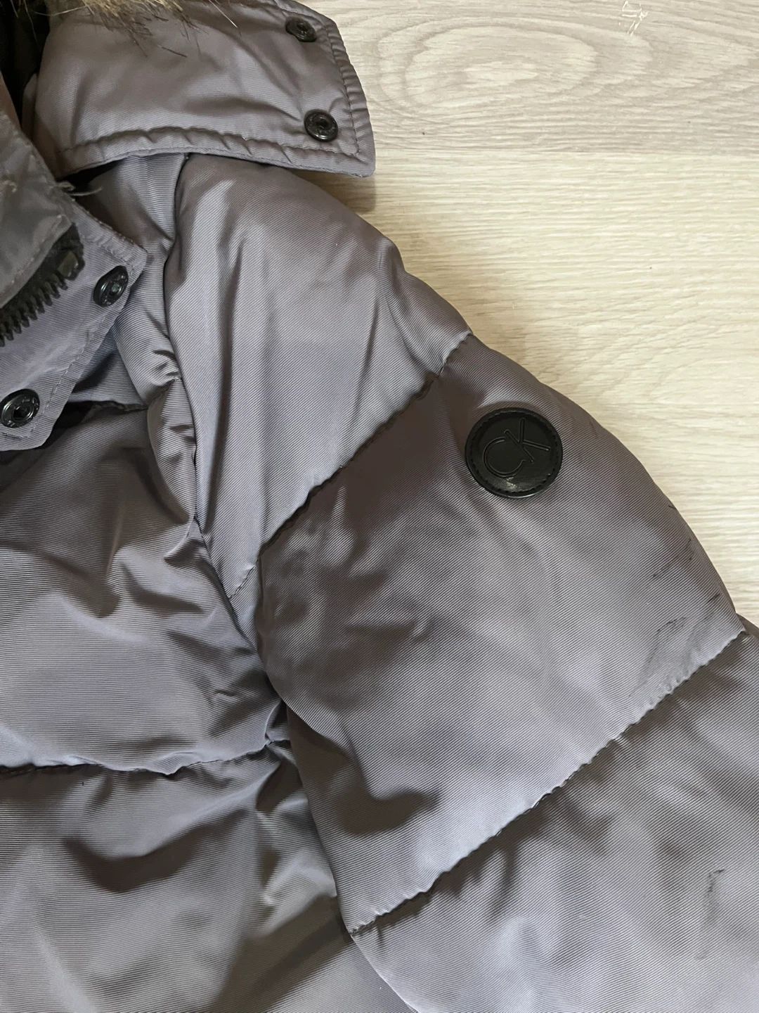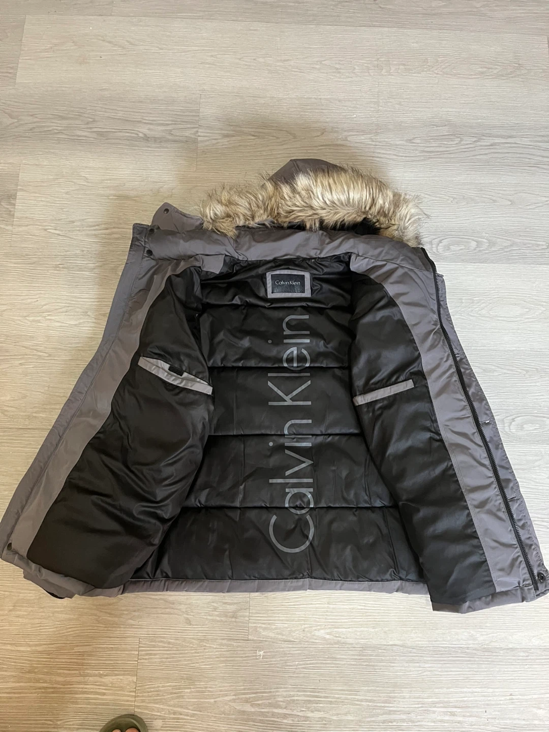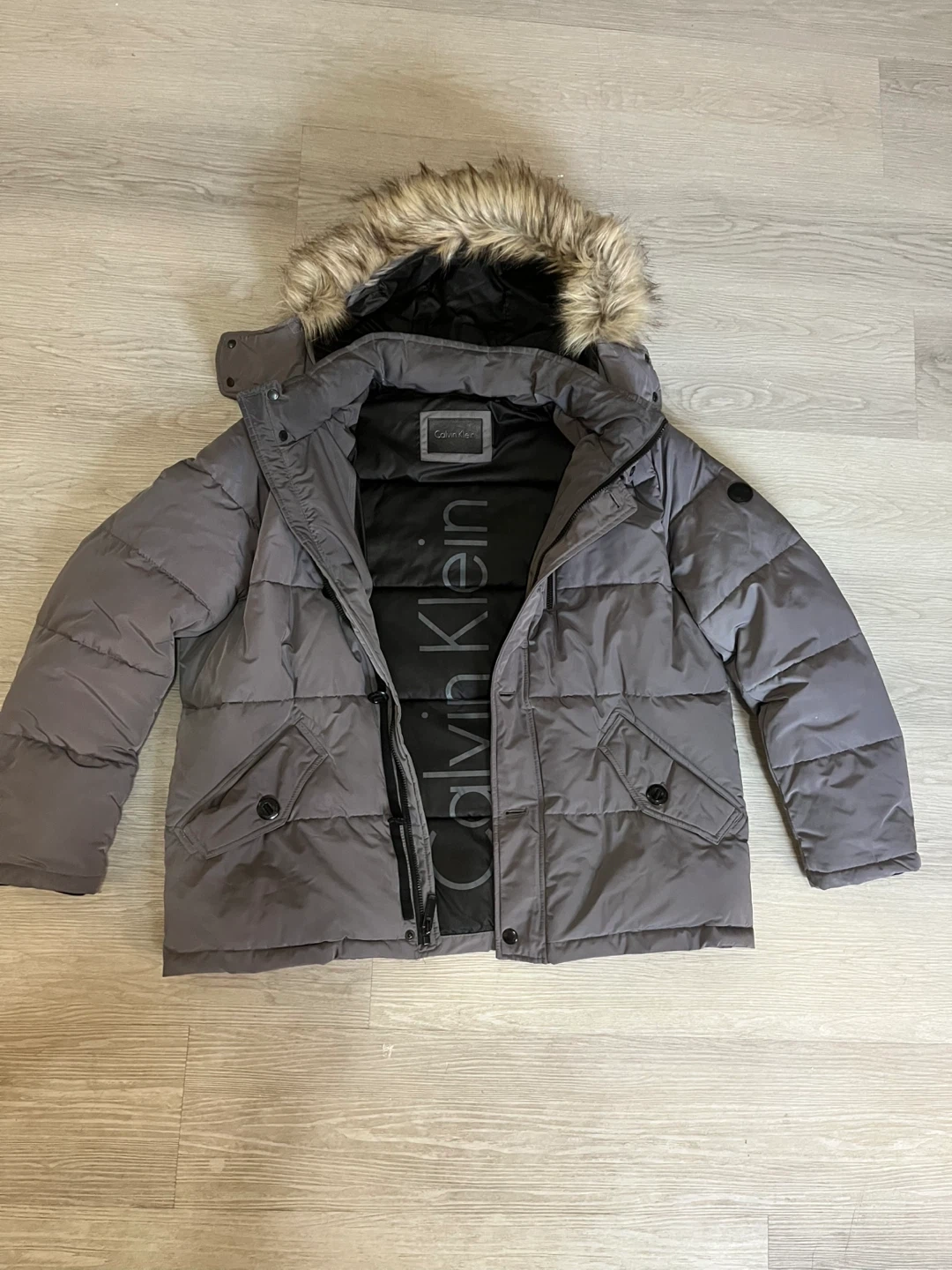Selling a Calvin Klein puffer jacket in a lovely grey colour! It's a size large and features a faux fur hood trim.