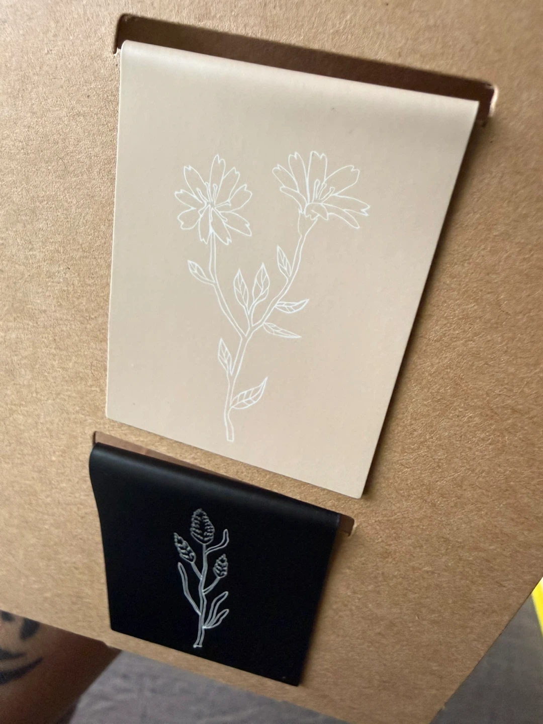 - Includes one cream bookmark with a floral illustration and one black bookmark with a seed stalk illustration.
