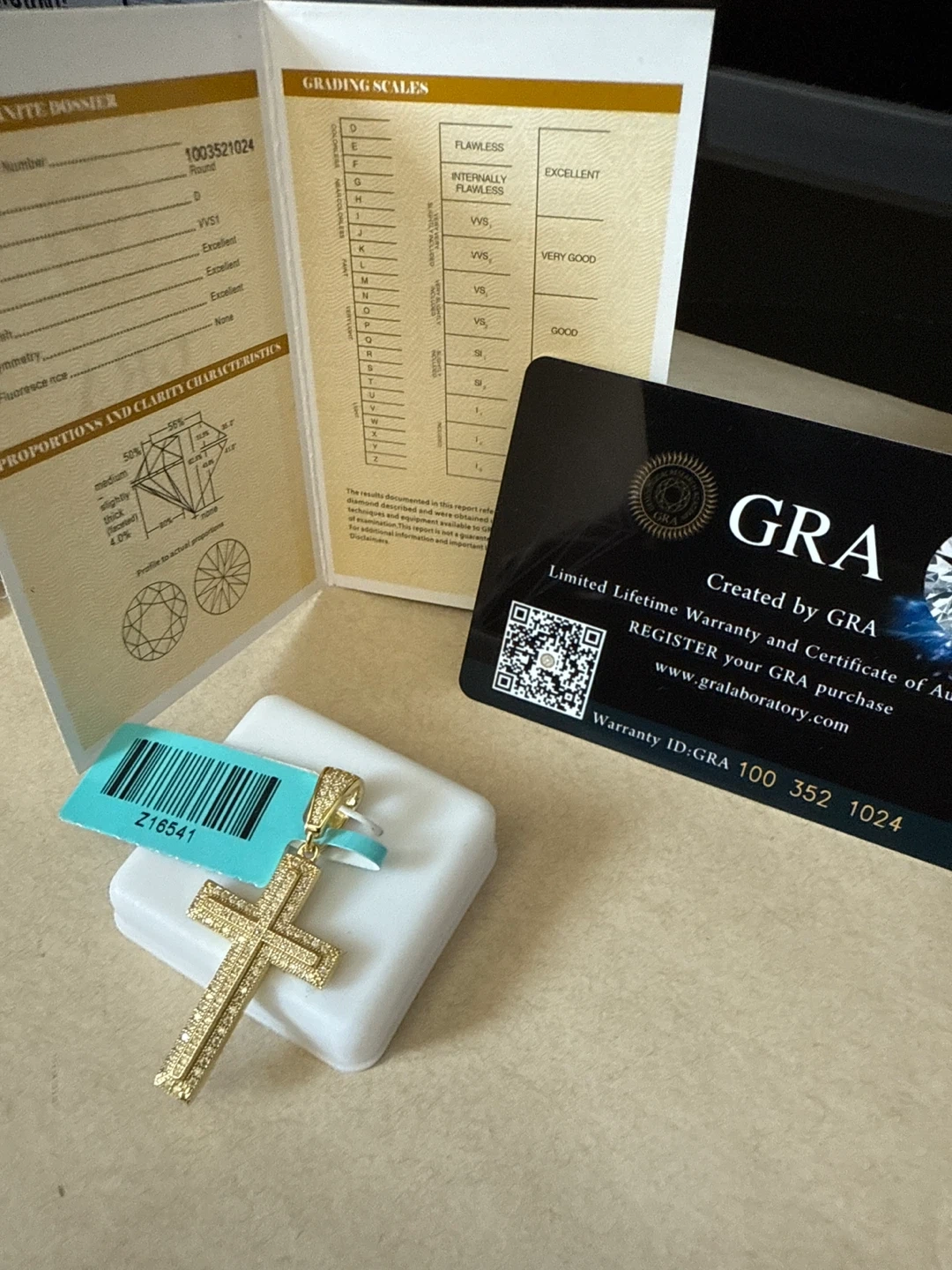 This is a GRA Moissanite cross pendant. It comes with a certificate of authenticity and grading report from the Global Gemological Research Academy. Register your GRA purchase for a limited lifetime warranty.