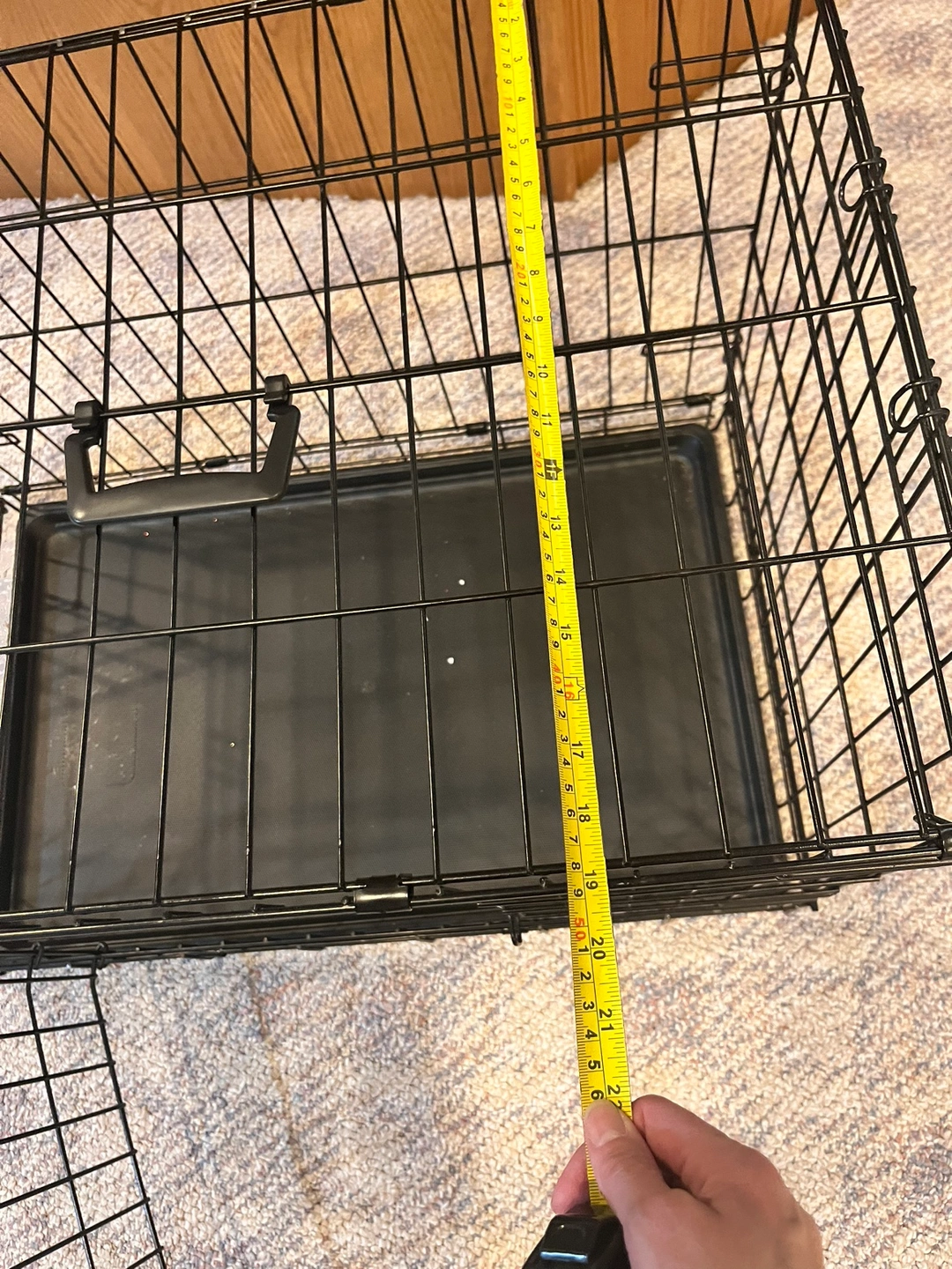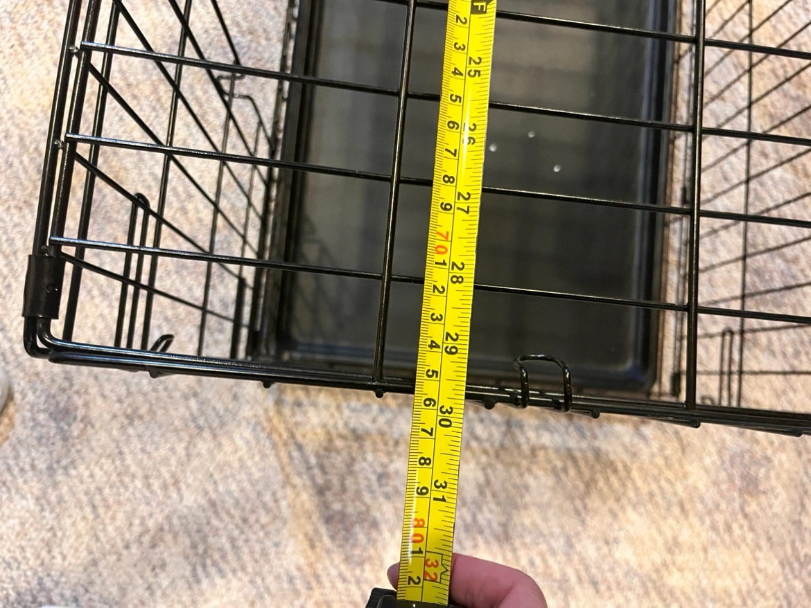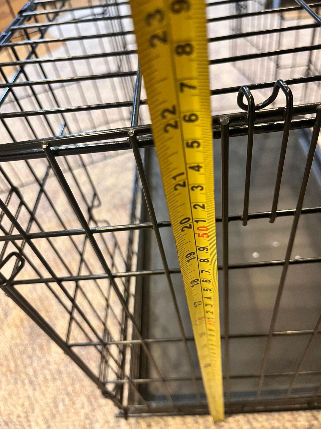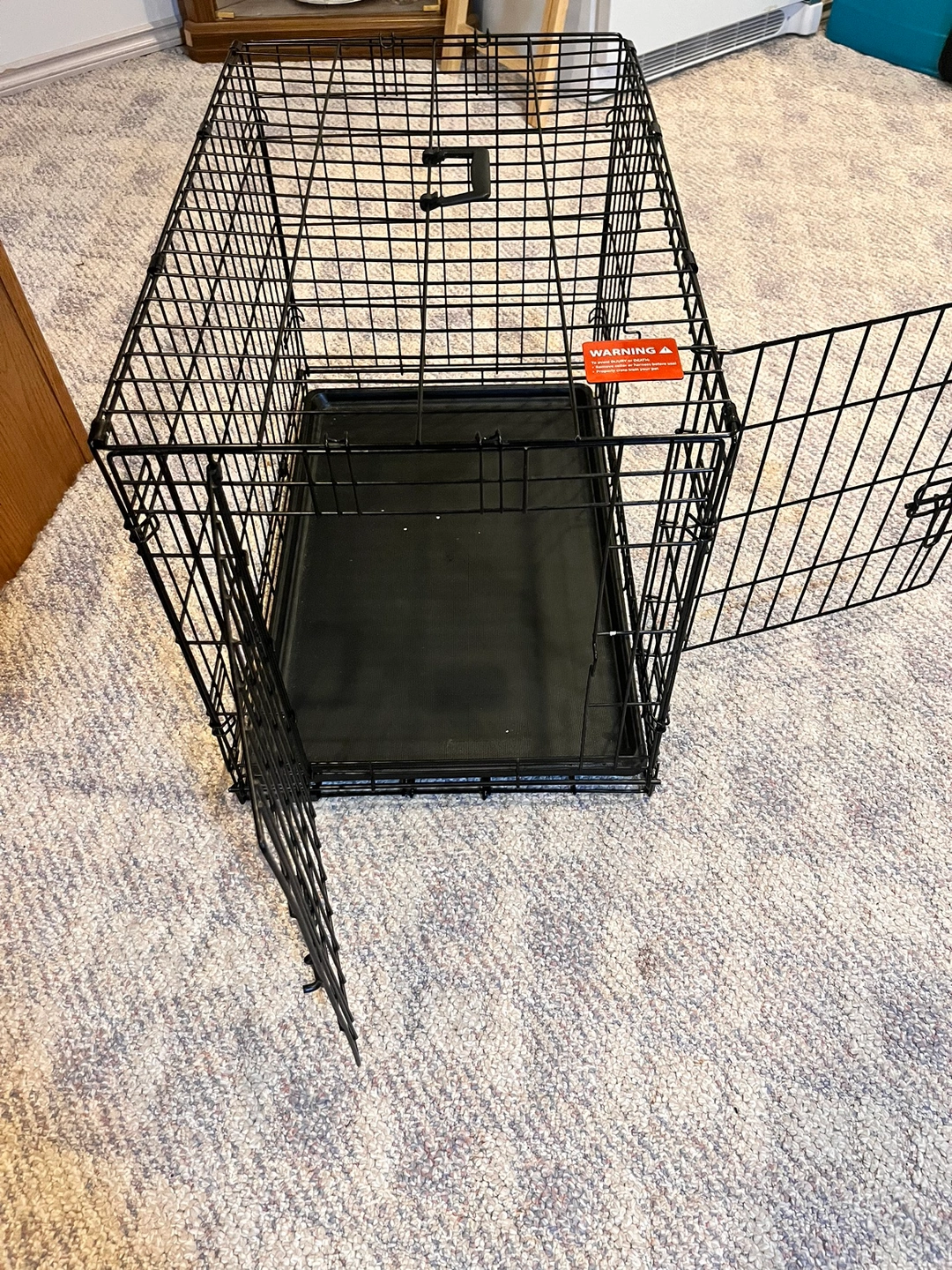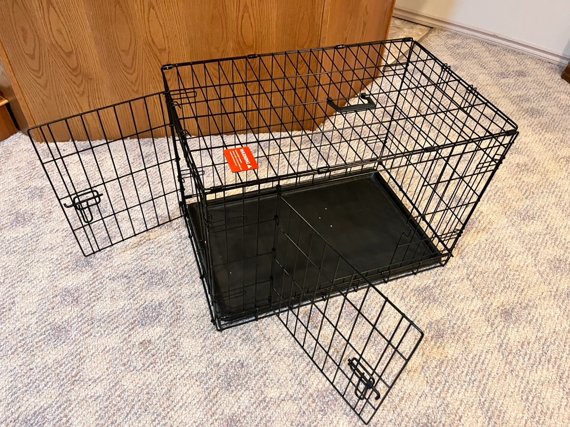 Black metal dog crate with a pull out tray. The crate has two doors on the front and one on the side. It measures approximately 30" long by 22 high.