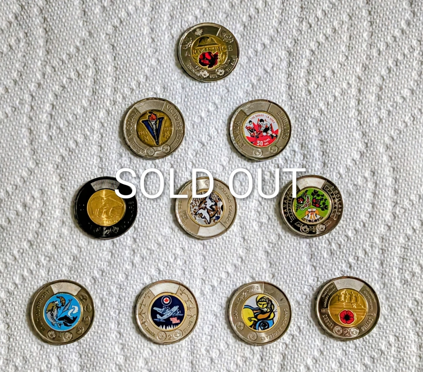Assortment of Canadian 2 dollar coins featuring various commemorative designs. These coins are collector's items for numismatists. Variety of themes includes Vimy Ridge, hockey, and other Canadian heritage motifs.