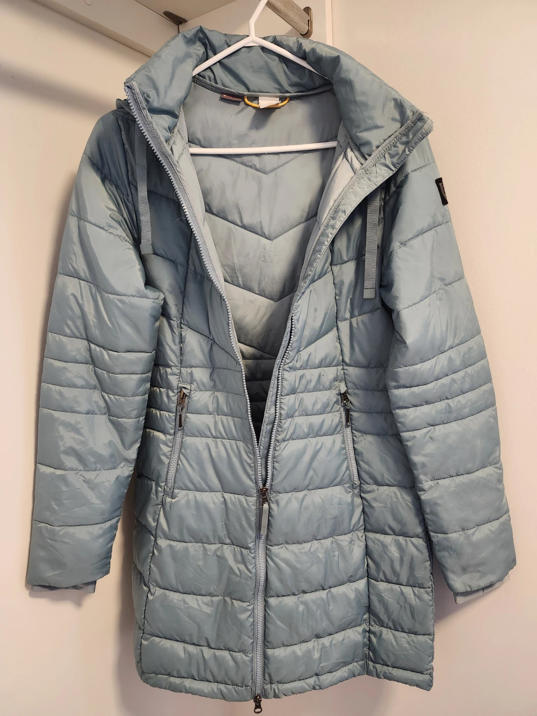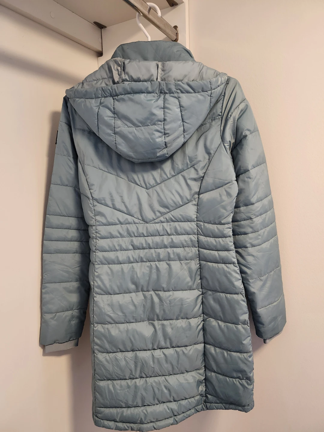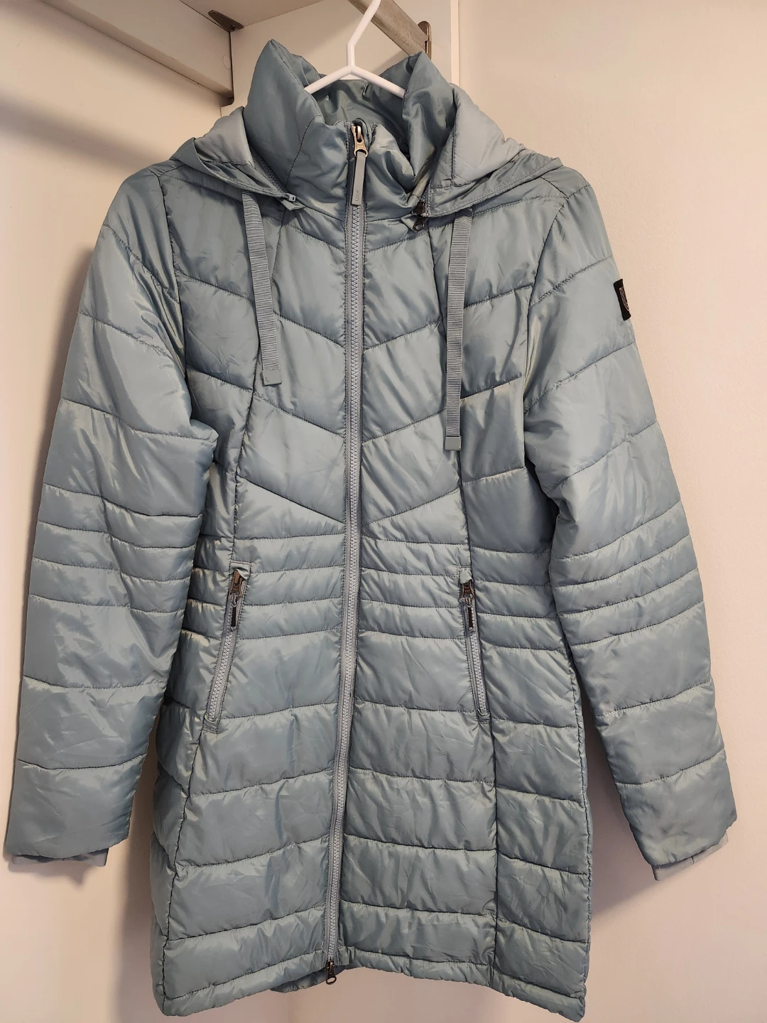 Lole light blue quilted puffer jacket, in lightly worn and very clean condition. No defects. From a NS, NP home. Zippered pockets, extendable cuff, detachable hood. Great jacket for spring and fall weather.