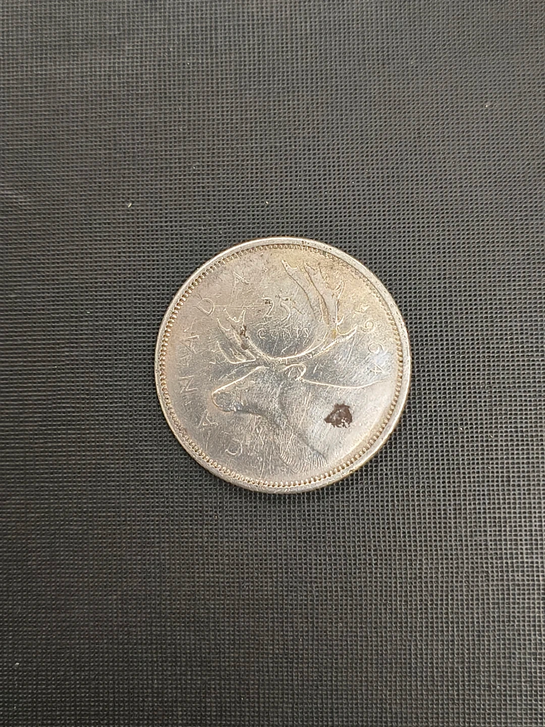 Selling a Canadian quarter from 1965! It features Queen Elizabeth II on one side and a caribou on the other. A great piece for collectors!