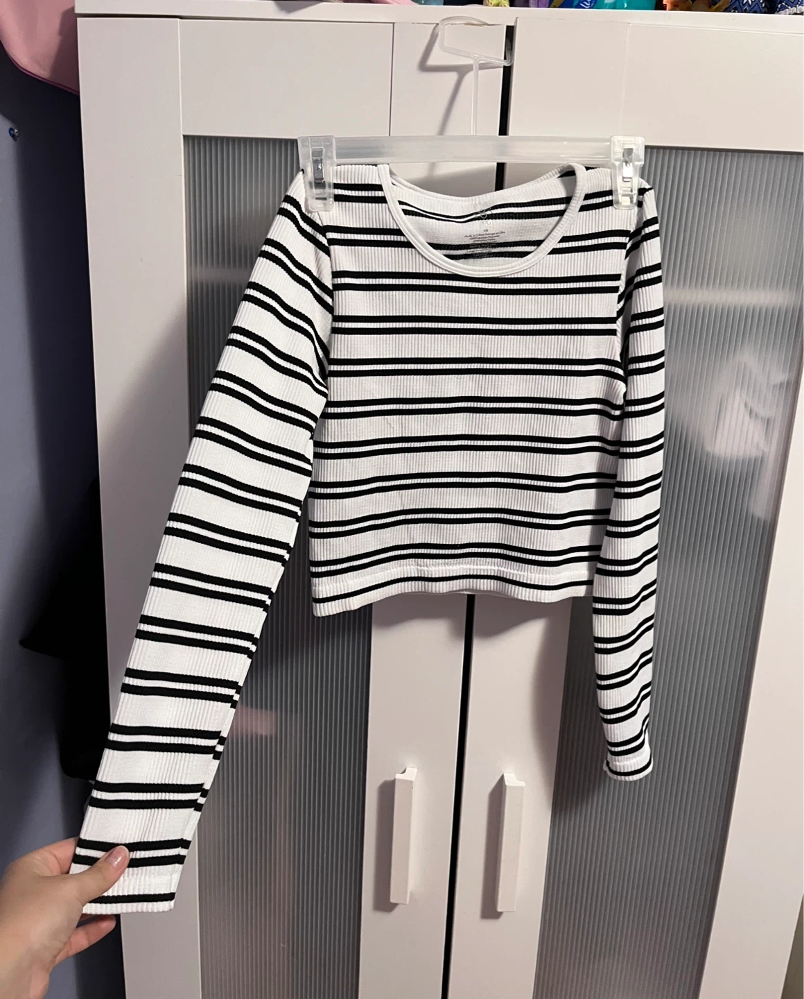 Two cute long-sleeved tops from Aura, both size S/M! One is black and the other is white with black stripes. They're made of 92% nylon and 8% spandex.