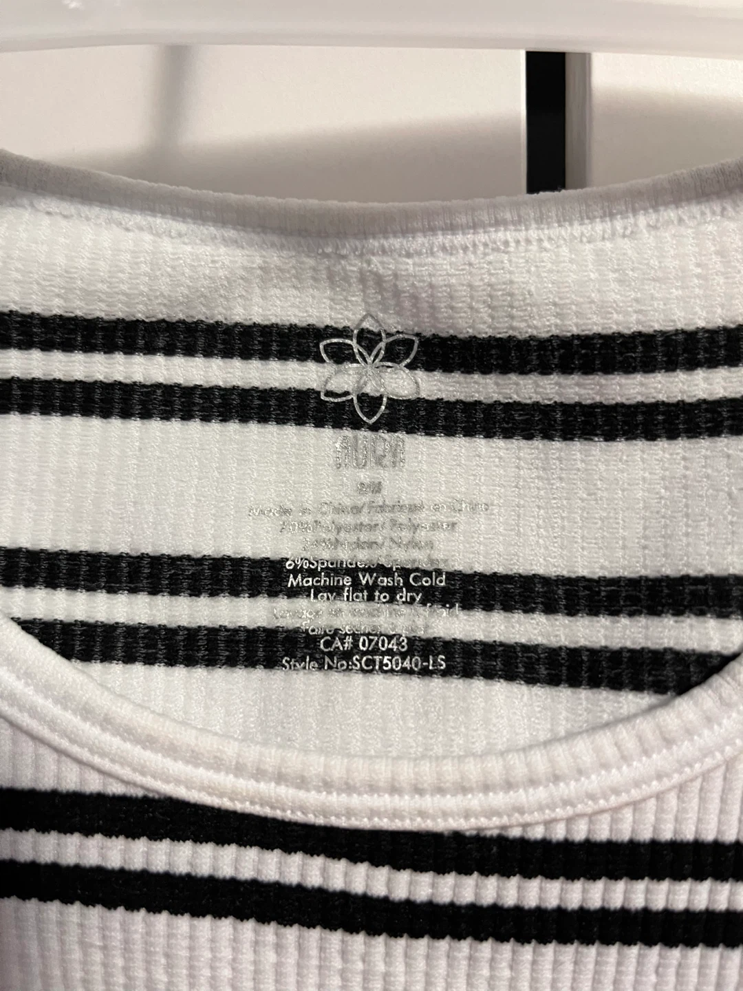 Two cute long-sleeved tops from Aura, both size S/M! One is black and the other is white with black stripes. They're made of 92% nylon and 8% spandex.