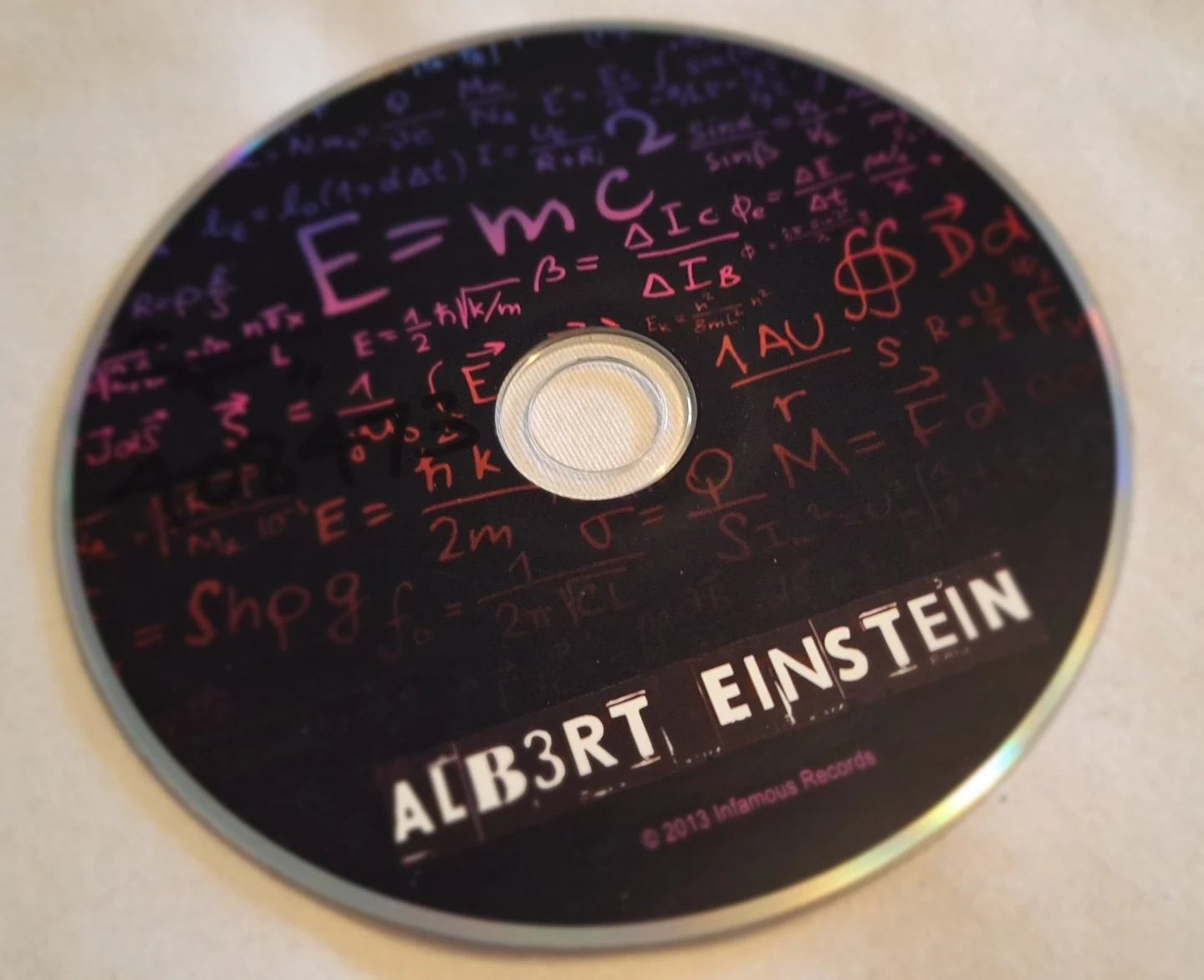This CD features Albert Einstein's iconic 'E=mc²' equation and other scientific formulas. It's from Infamous Records, released in 2013. Great for science enthusiasts!