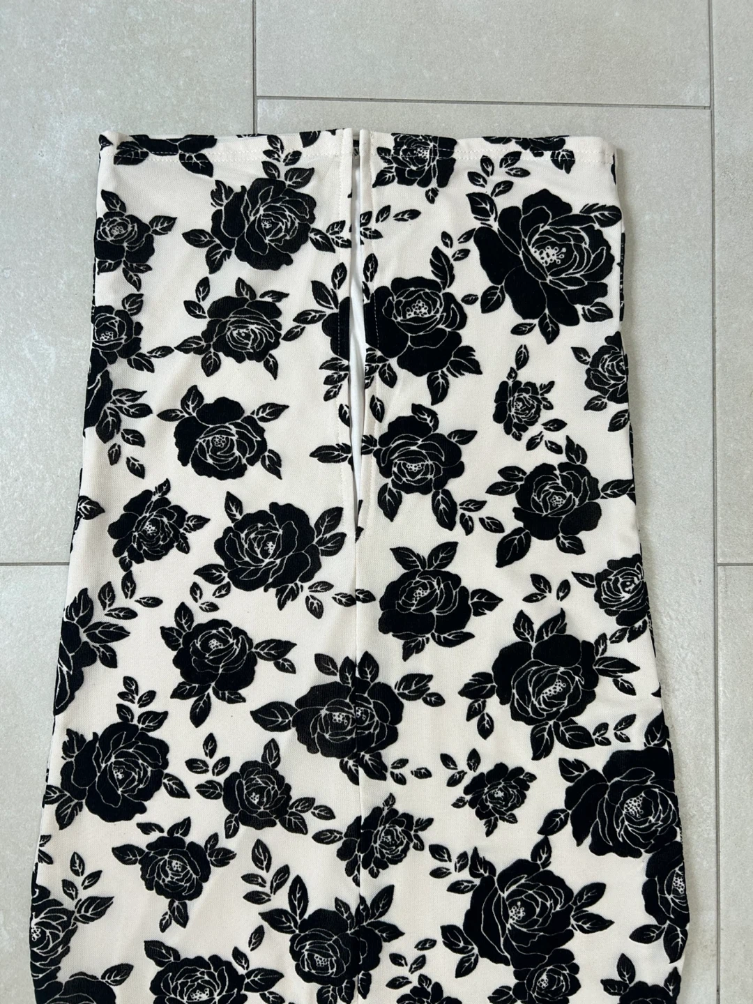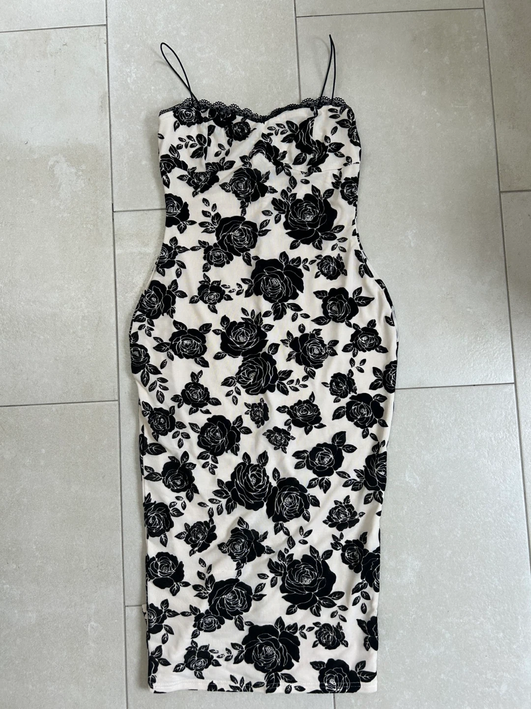 A fitted cream dress featuring a bold black rose print throughout. It has delicate spaghetti straps and lace trim along the neckline. This is a stylish option for an evening out!