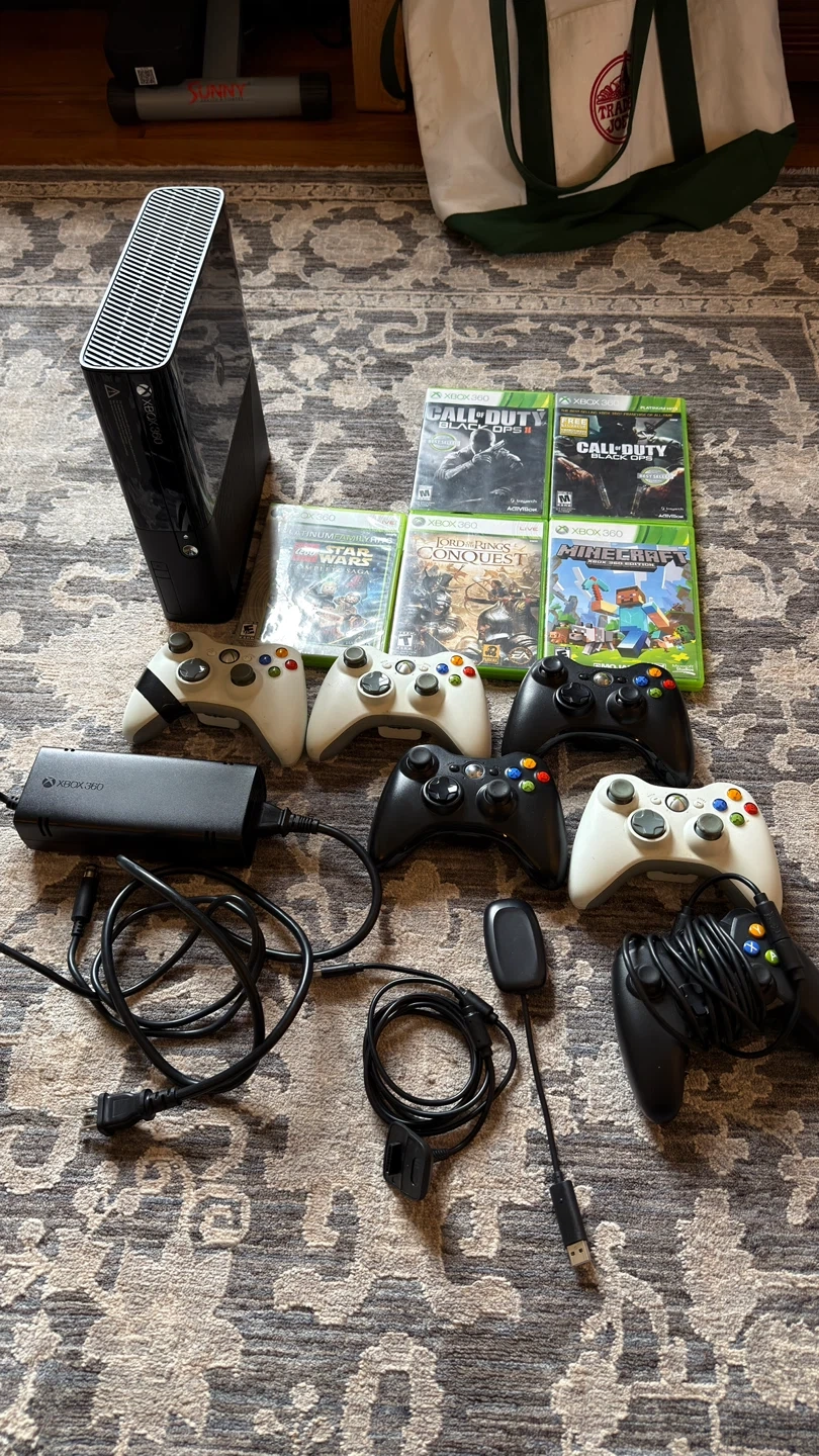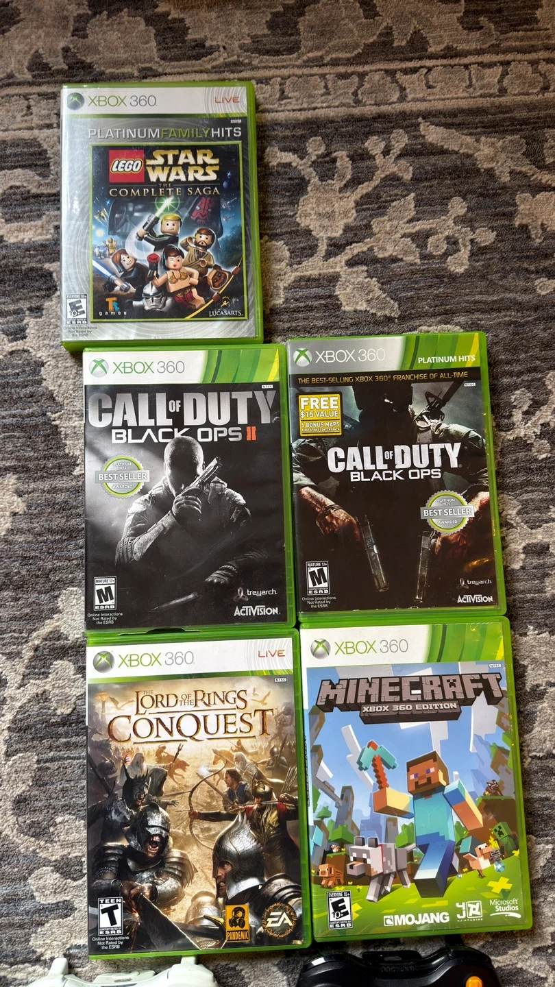 This bundle includes a black Xbox 360 console purchased in 2016. Fully functional. It comes with an AC adapter, 2 wired controller 2, and three wireless controllers. Also included are five games: Lego Star Wars, Call of Duty: Black Ops II, Call of Duty: Black Ops, The Lord of the Rings: Conquest, and Minecraft: Xbox 360 Edition. It's a great collection for Xbox gaming!
