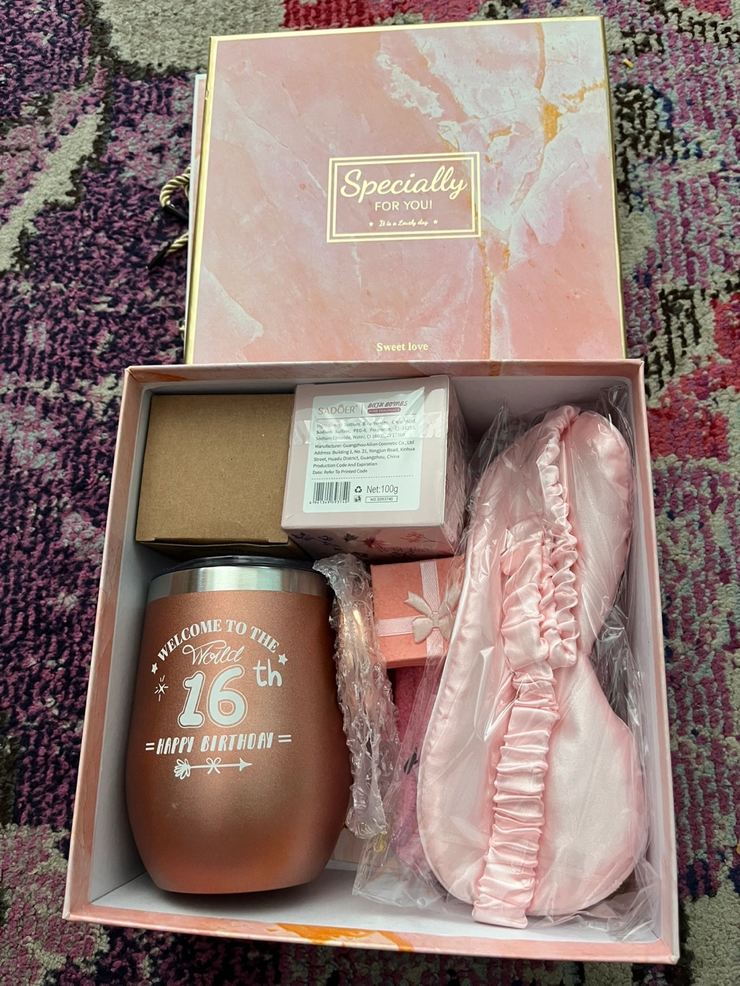A lovely pink gift set. The set contains several self-care items, like a sleep mask, socks and a candle. Perfect for relaxation after a long day.