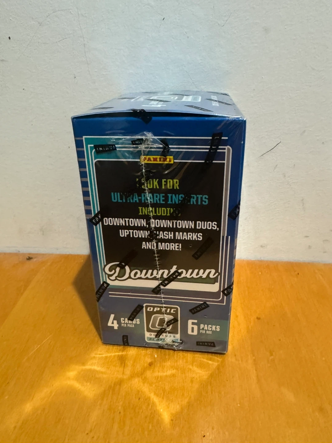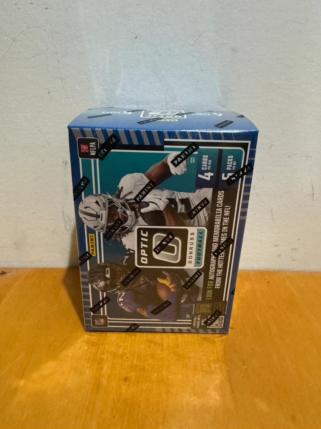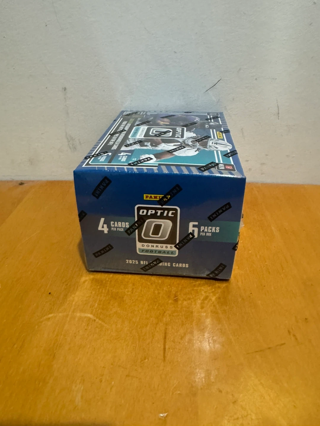 This 2025 Panini Donruss Optic NFL Football trading card blaster box contains 6 packs with 4 cards per pack, totaling 24 cards. Look for Ultra-Rare inserts like Downtown, Downtown Duos, and Uptown Flash Marks. You'll also find autograph and memorabilia cards from top NFL players.