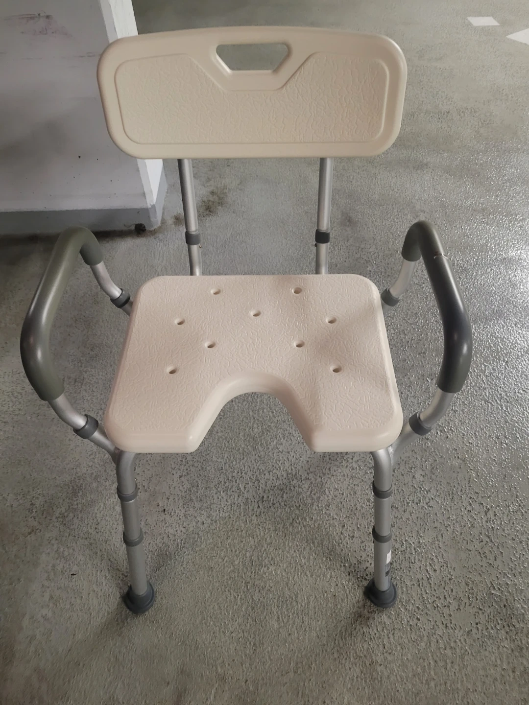 This shower chair features a contoured seat and supportive arms. It's height adjustable with non-slip rubber feet for stability. The open front design is convenient for personal care. It provides a safer bathing experience.