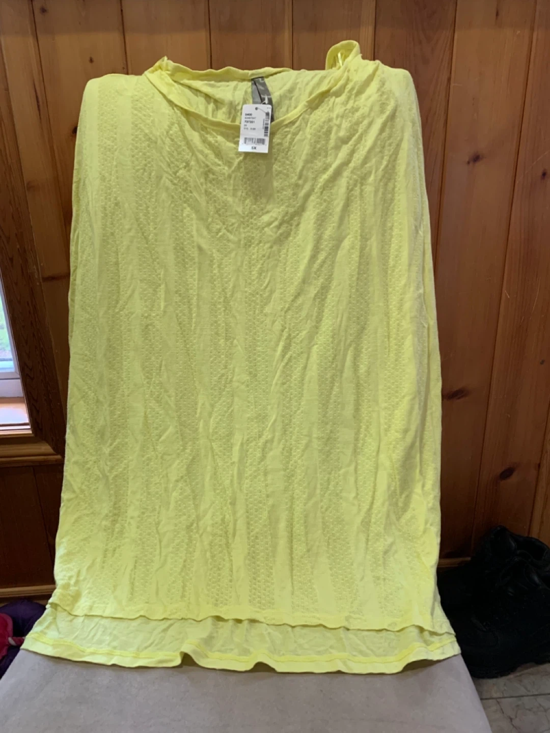 This women's yellow t-shirt features a perforated design for breathability. It's made from a lightweight fabric and has a relaxed fit. The shirt has a crew neck and short sleeves.