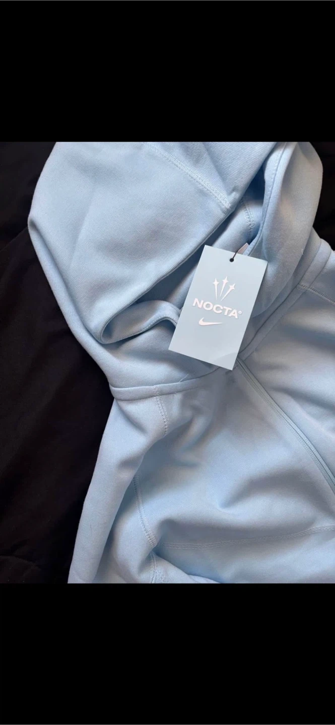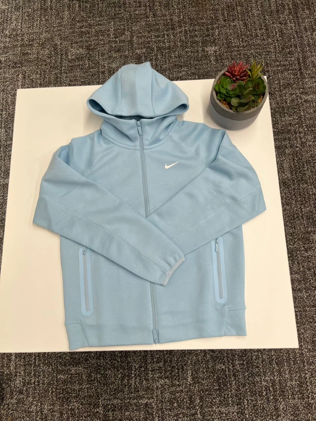 Nike NOCTA Tech Fleece zip-up hoodie in light blue. Features a full zip closure and pockets. Made with Tech Fleece material.