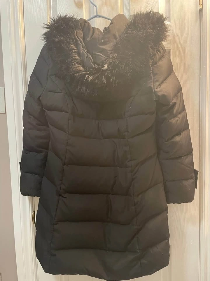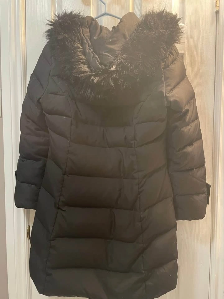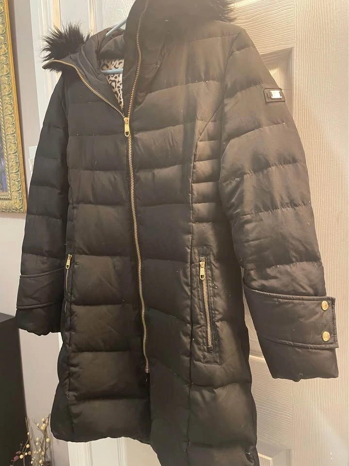 Calvin Klein winter jacket with removable fur trim on the hood. It was just cleaned. This size Medium jacket has down feathers and all zippers work well. Includes deep side zipper pockets and 2 inside pockets.