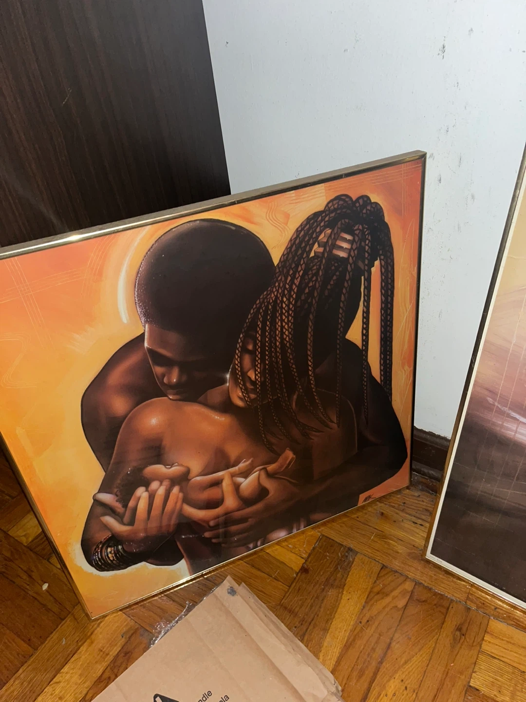 Beautiful framed art print depicting a couple embracing. The artwork features warm, vibrant colors with a golden frame. It's a lovely piece for home decor. Dimensions: [No dimensions visible in image].