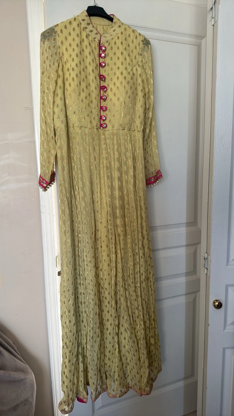 This indian dress is a beautiful yellow colour and features a subtle pattern. It is a long dress with pink trim, pearls and has long sleeves.