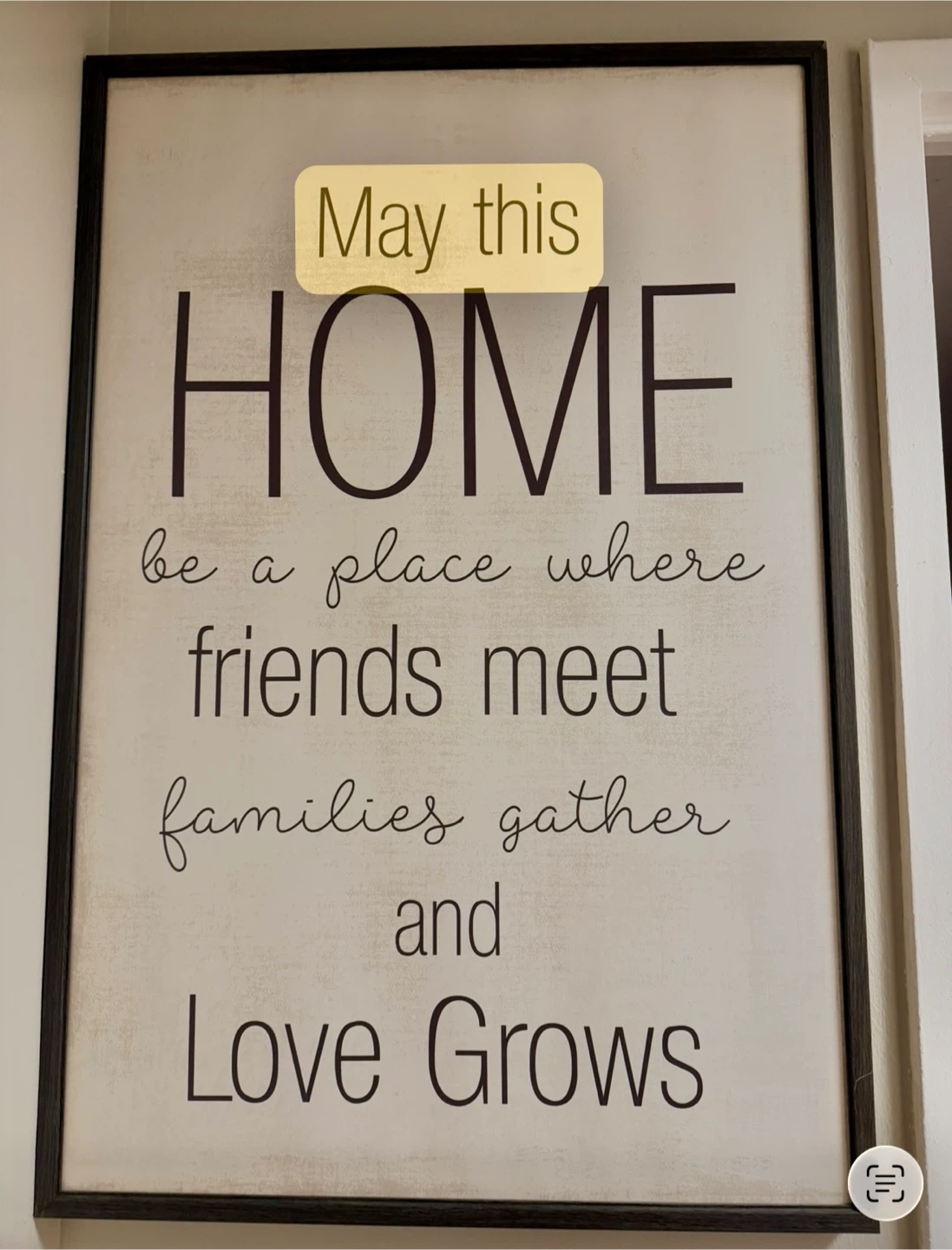 This wooden wall art features the quote "May this HOME be a place where friends meet, families gather and Love Grows." It's framed in a dark wood finish. This sign is perfect for adding a warm touch to your living space.
