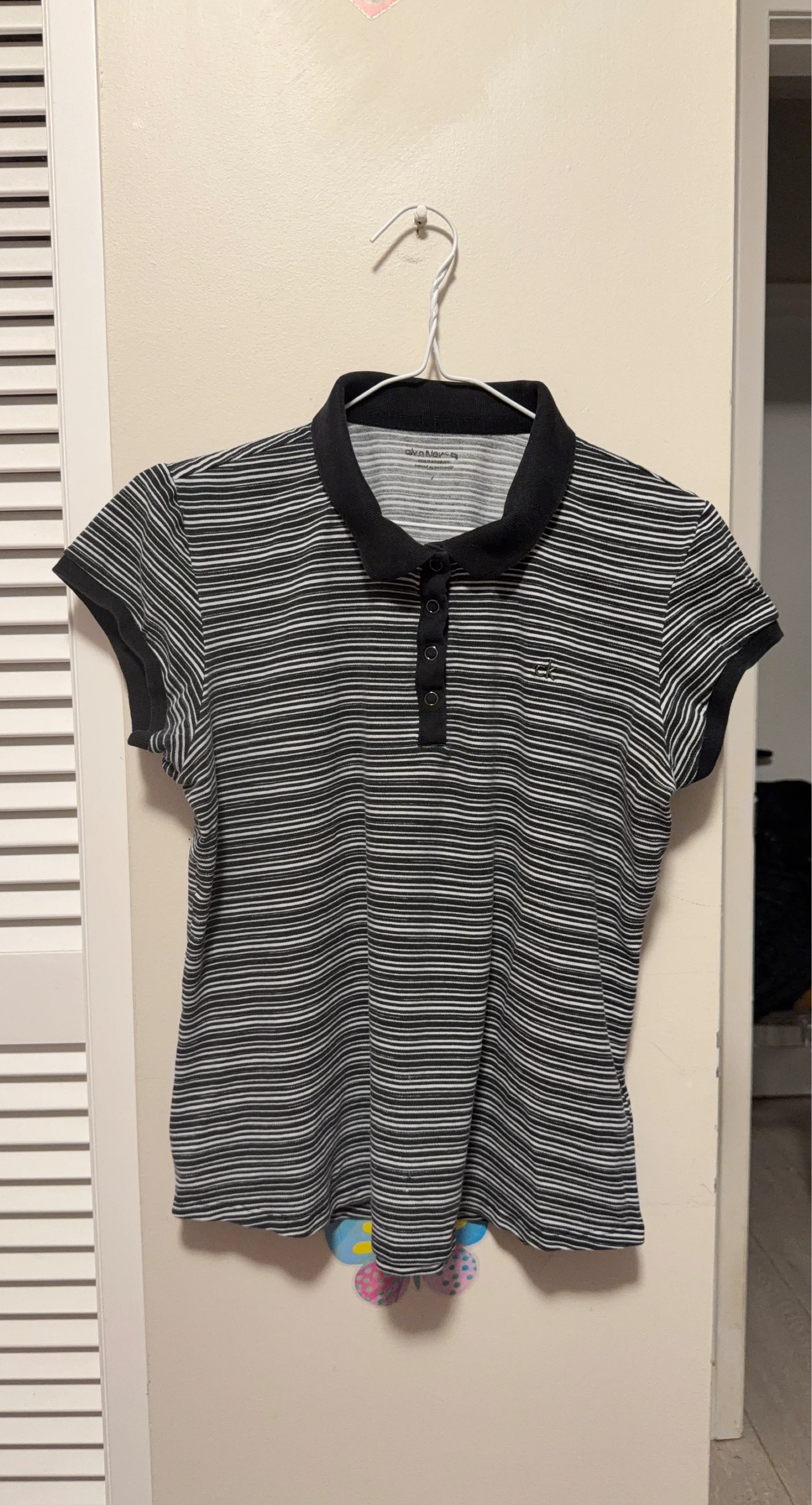 Classic black and white striped polo shirt from Calvin Klein. It's a size small with a black collar and button placket. Comfortable and stylish for everyday wear!
