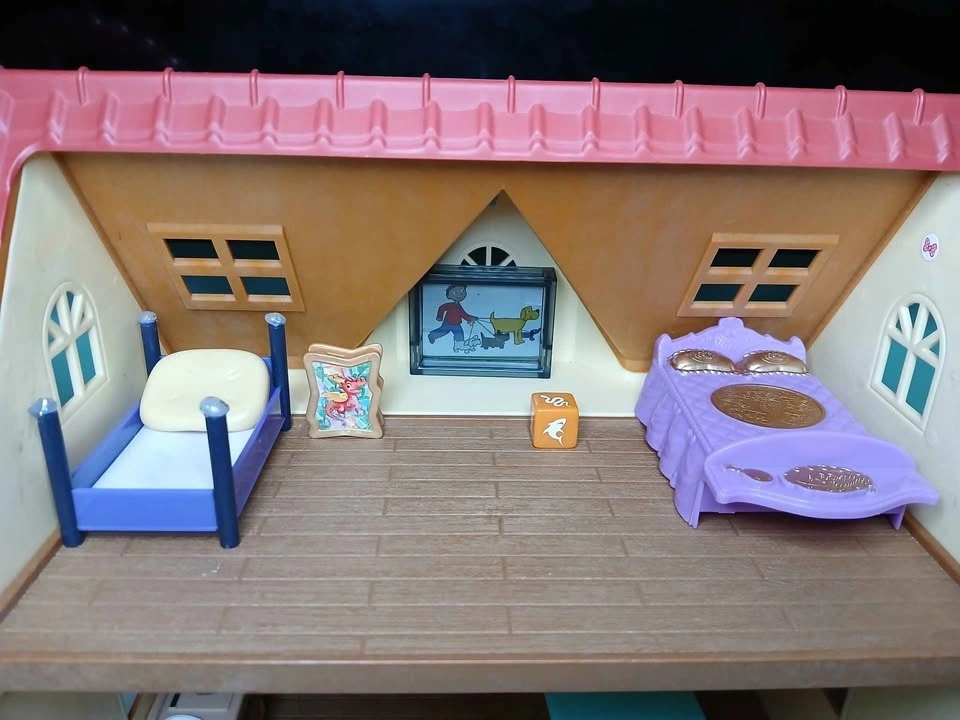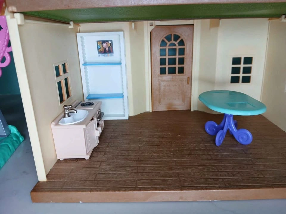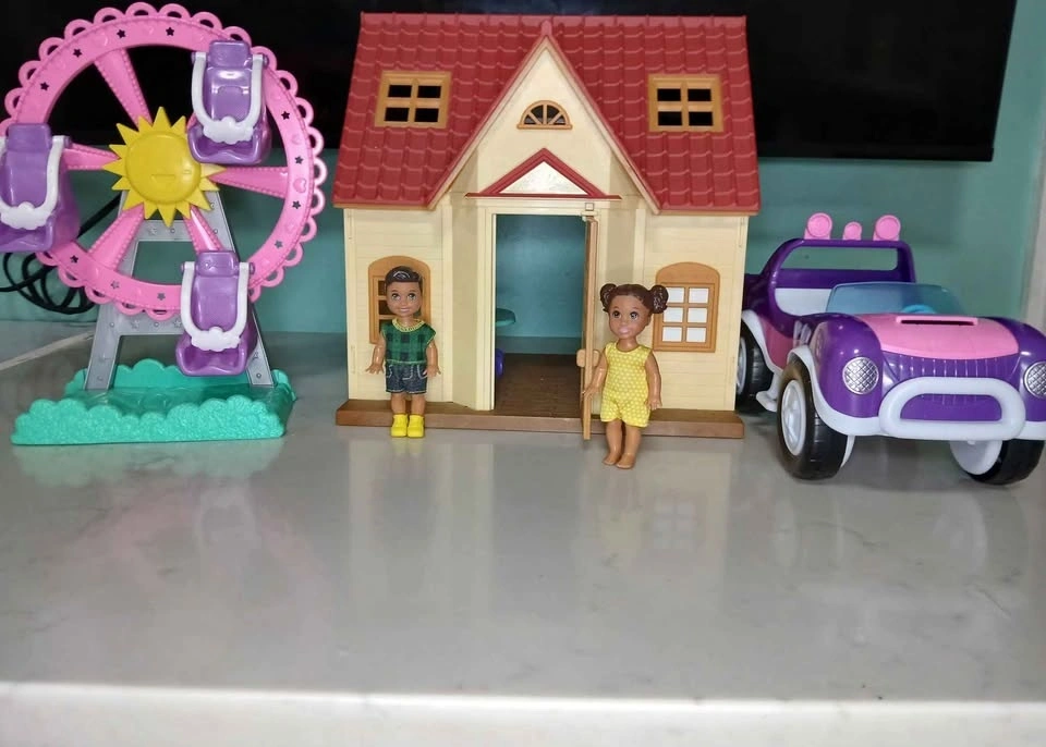 Great condition dollhouse set. Includes a dollhouse, car, Ferris wheel, and two dolls. The dollhouse has a bed, table, and sink. All pieces are clean and ready for play.