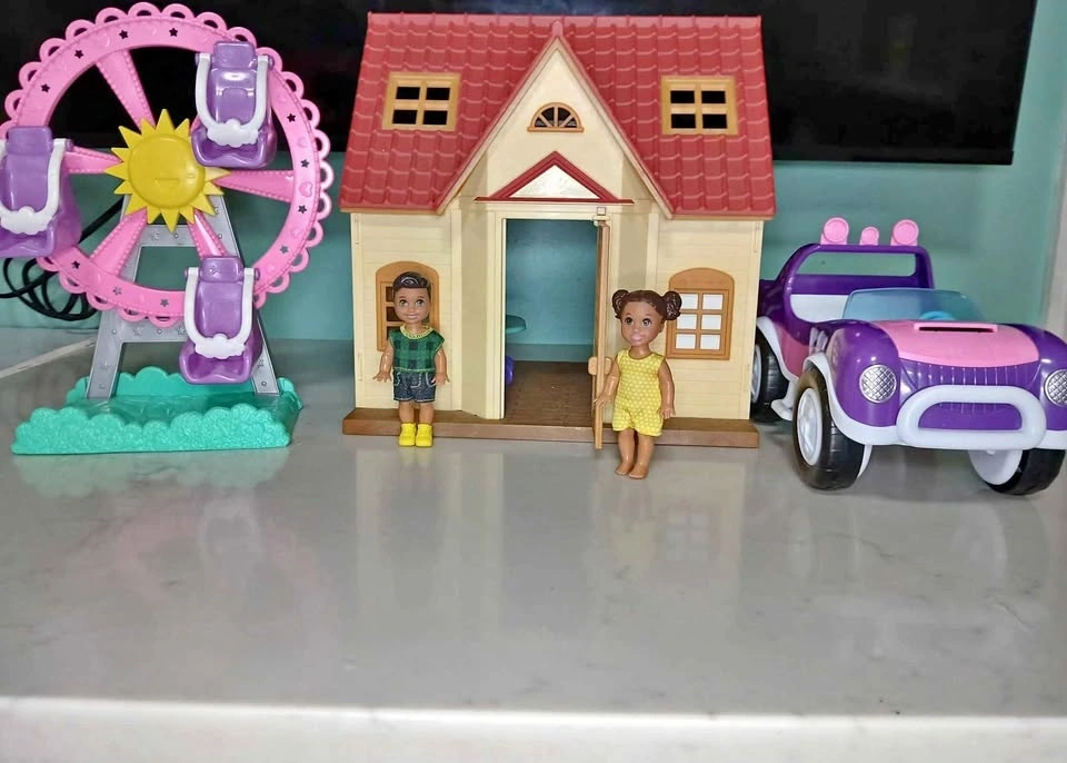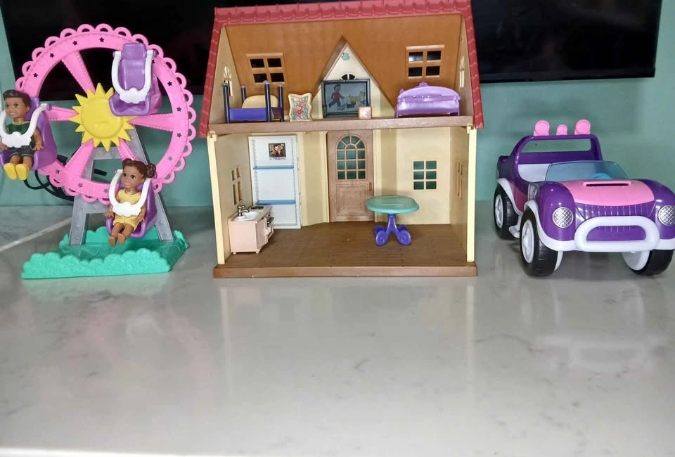 Great condition dollhouse set. Includes a dollhouse, car, Ferris wheel, and two dolls. The dollhouse has a bed, table, and sink. All pieces are clean and ready for play.
