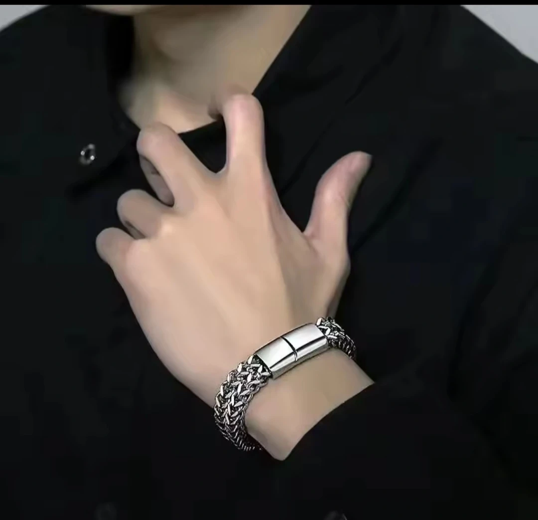 A chunky stainless steel chain bracelet with a secure clasp. It's 21cm long and 8mm wide. This bracelet adds a stylish touch to any outfit.