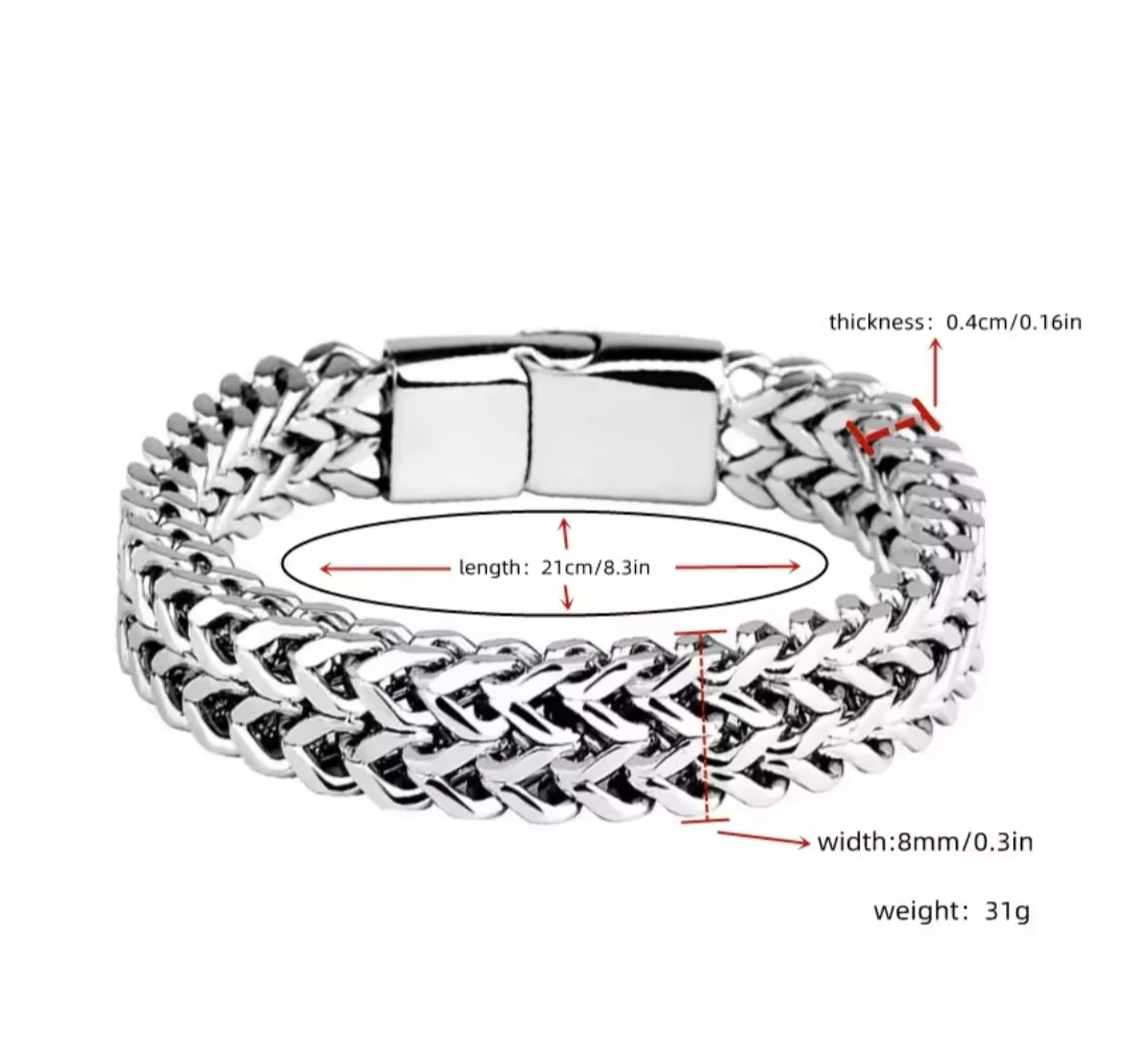 A chunky stainless steel chain bracelet with a secure clasp. It's 21cm long and 8mm wide. This bracelet adds a stylish touch to any outfit.
