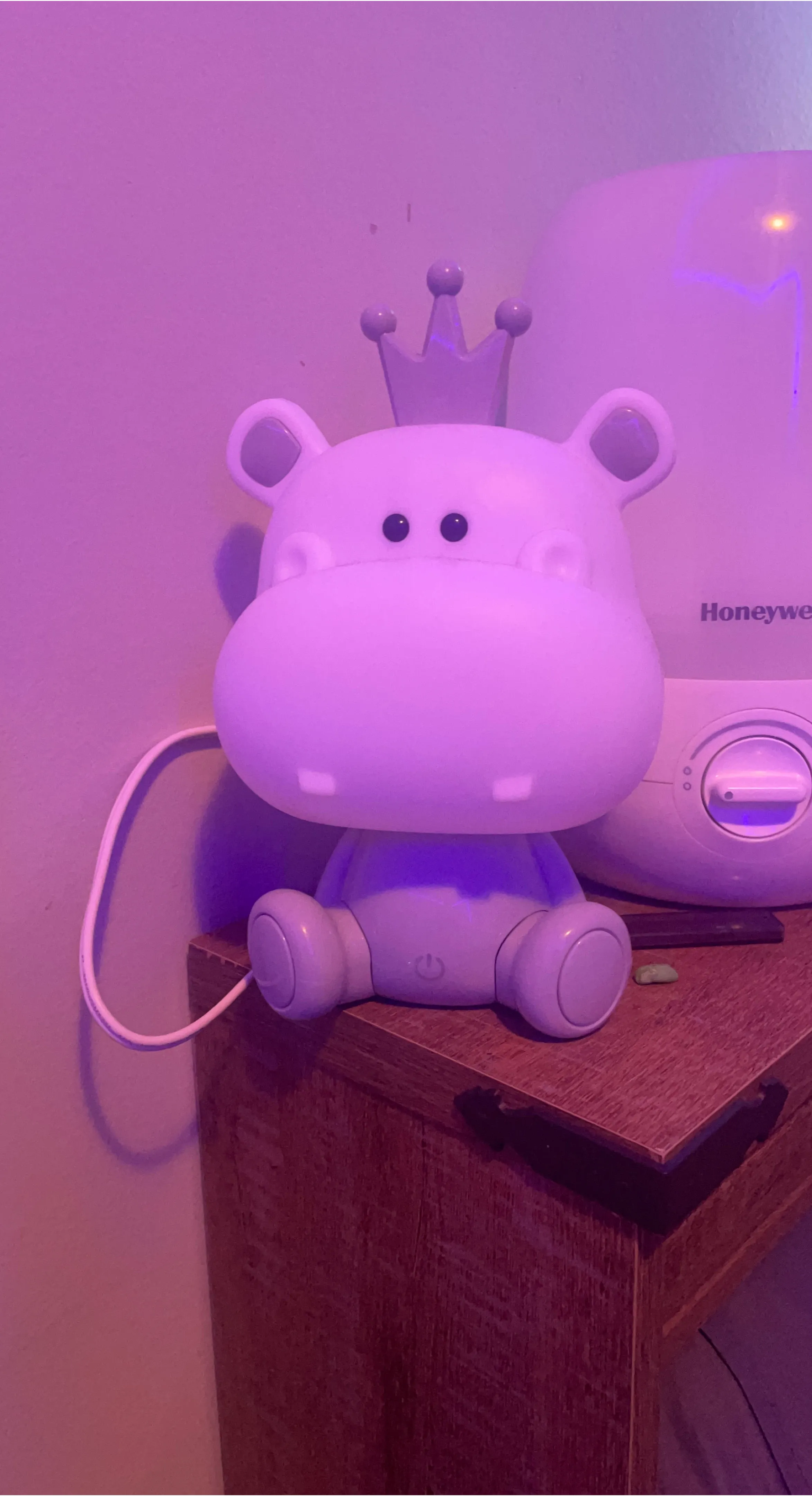 Adorable hippo shaped night light with a little crown on its head. It's perfect for a child's room or as a fun decorative piece. The light is powered by a plug-in cord. It's a charming addition to any space!
