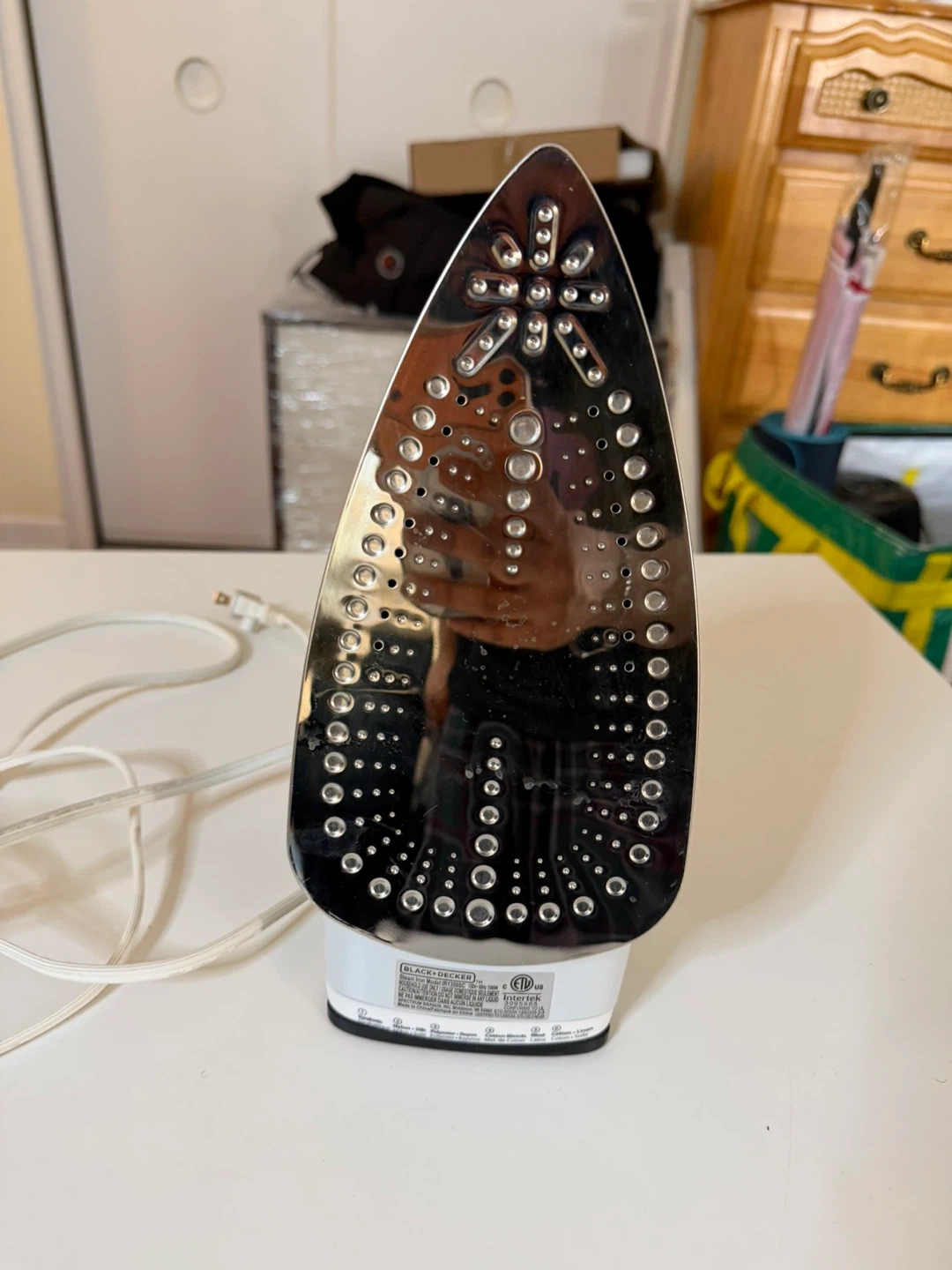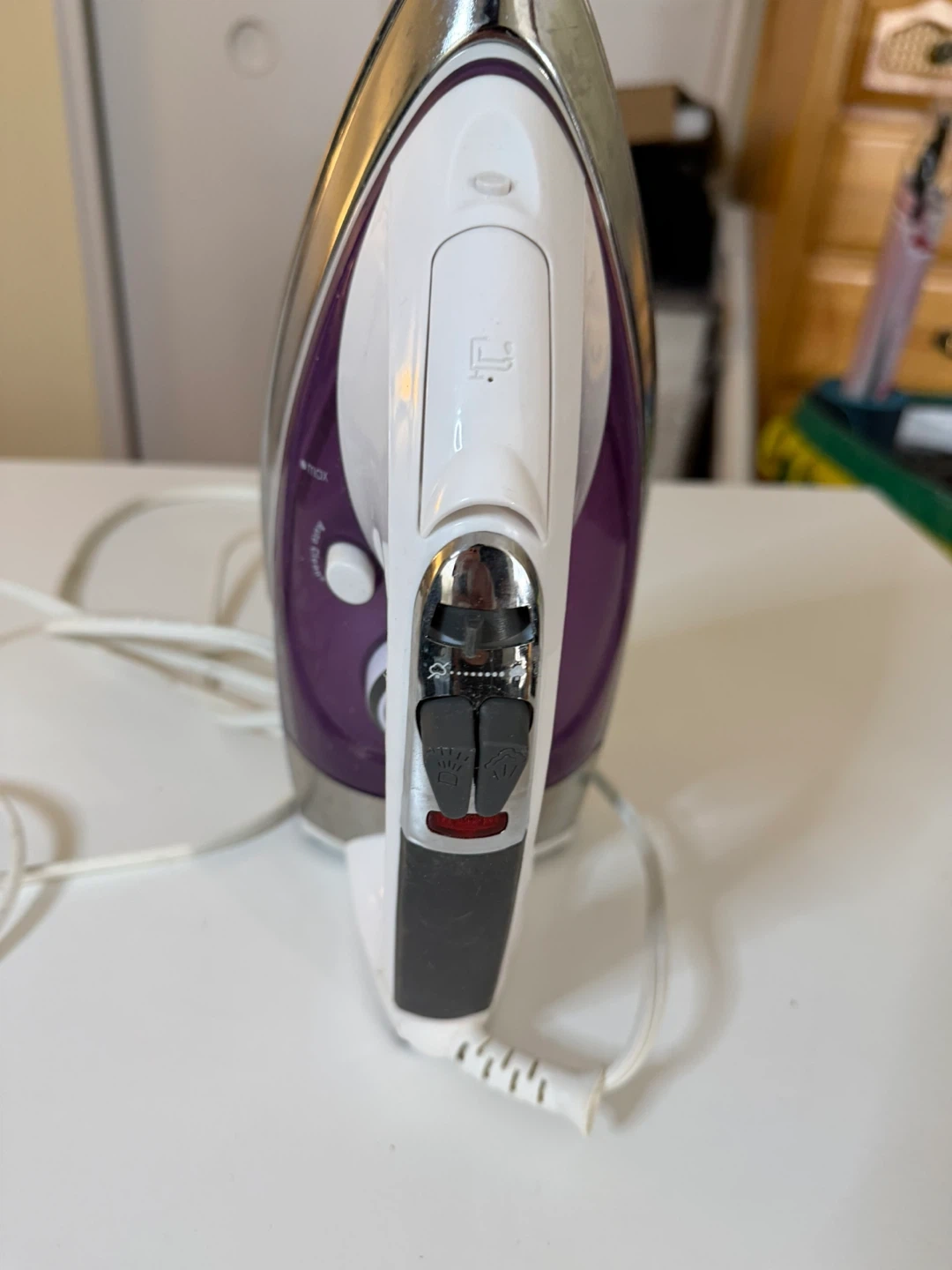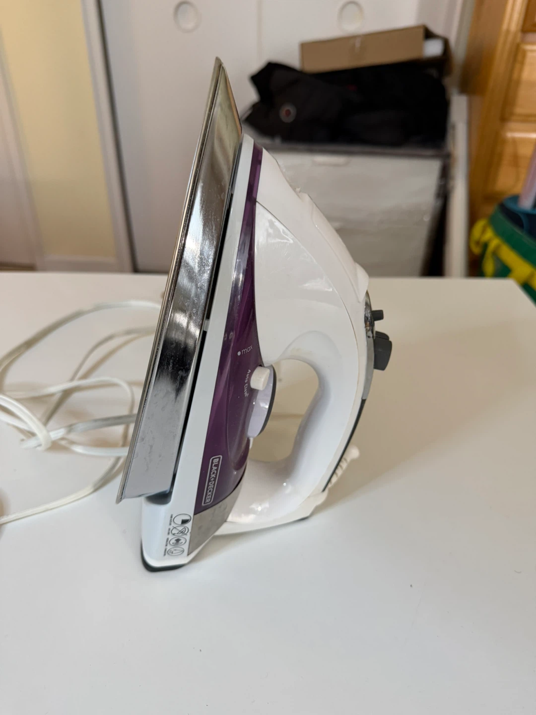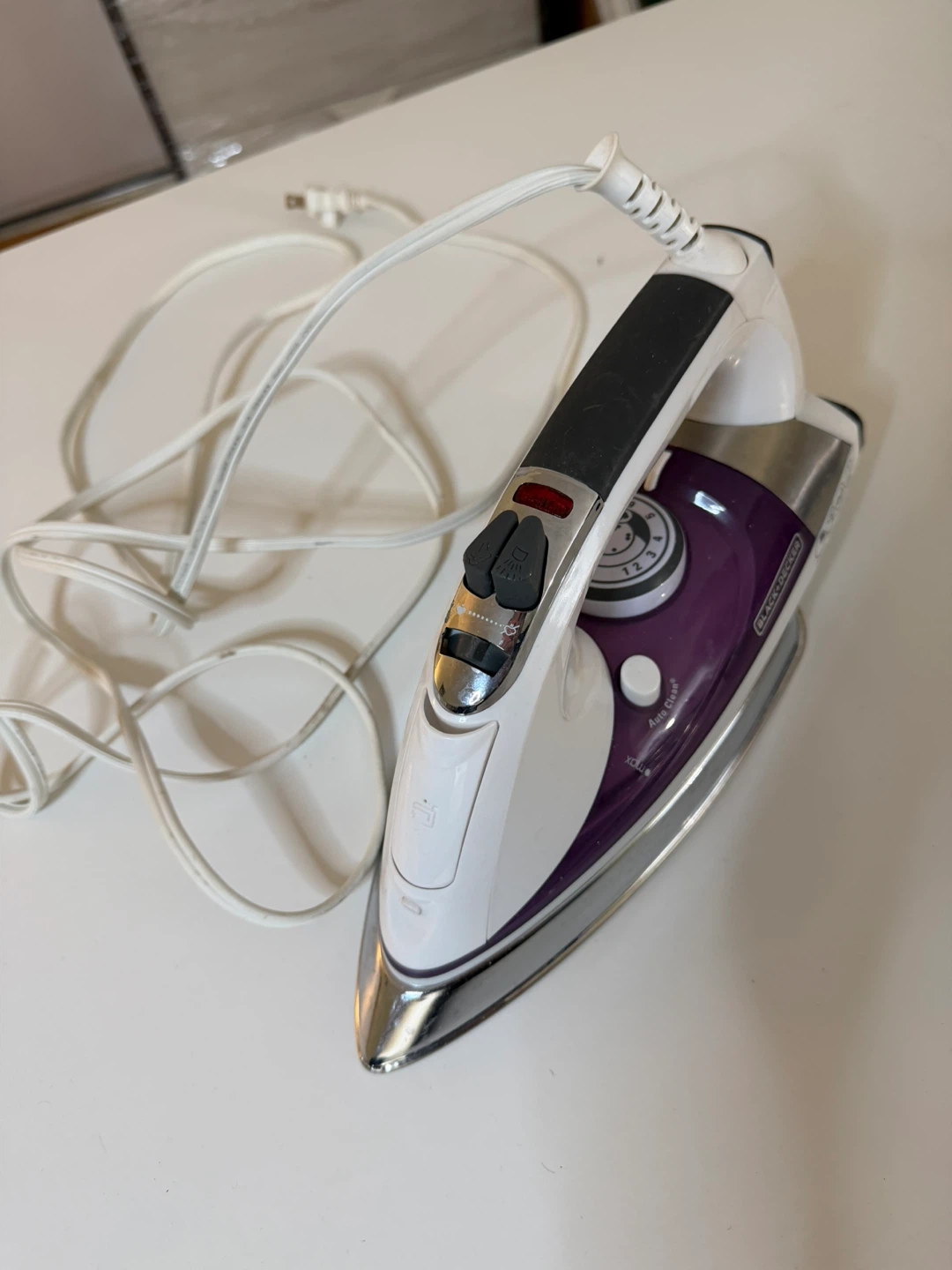 This is a Black+Decker steam iron. It has a stainless steel soleplate and a white and purple casing. Adjustable temperature and steam settings are available.