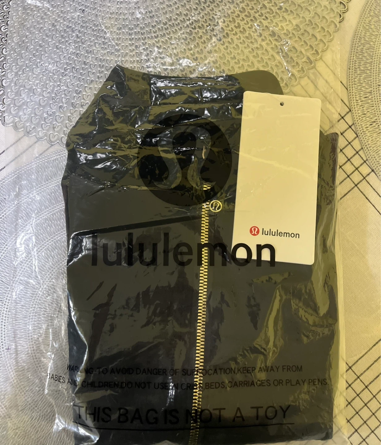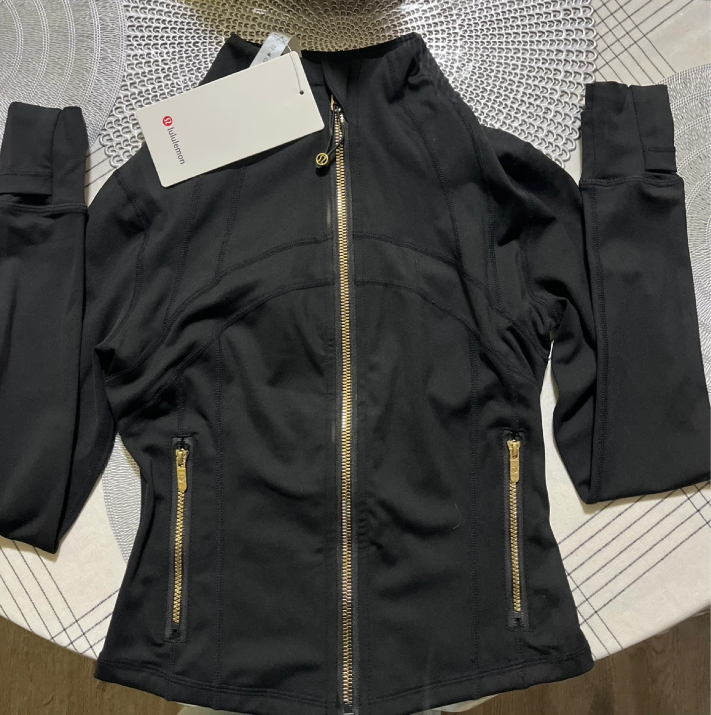 Black Lululemon jacket with gold zipper details. Includes thumbholes and zippered pockets. This jacket comes in its original packaging