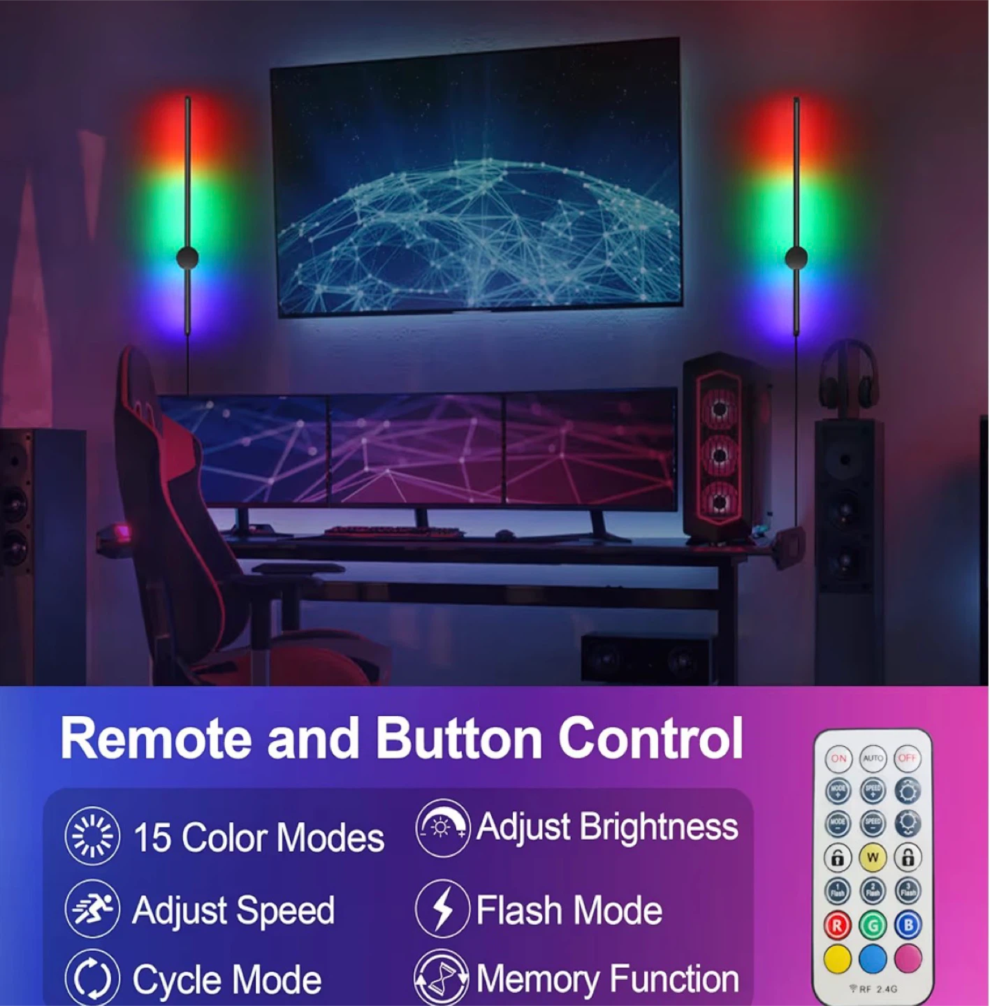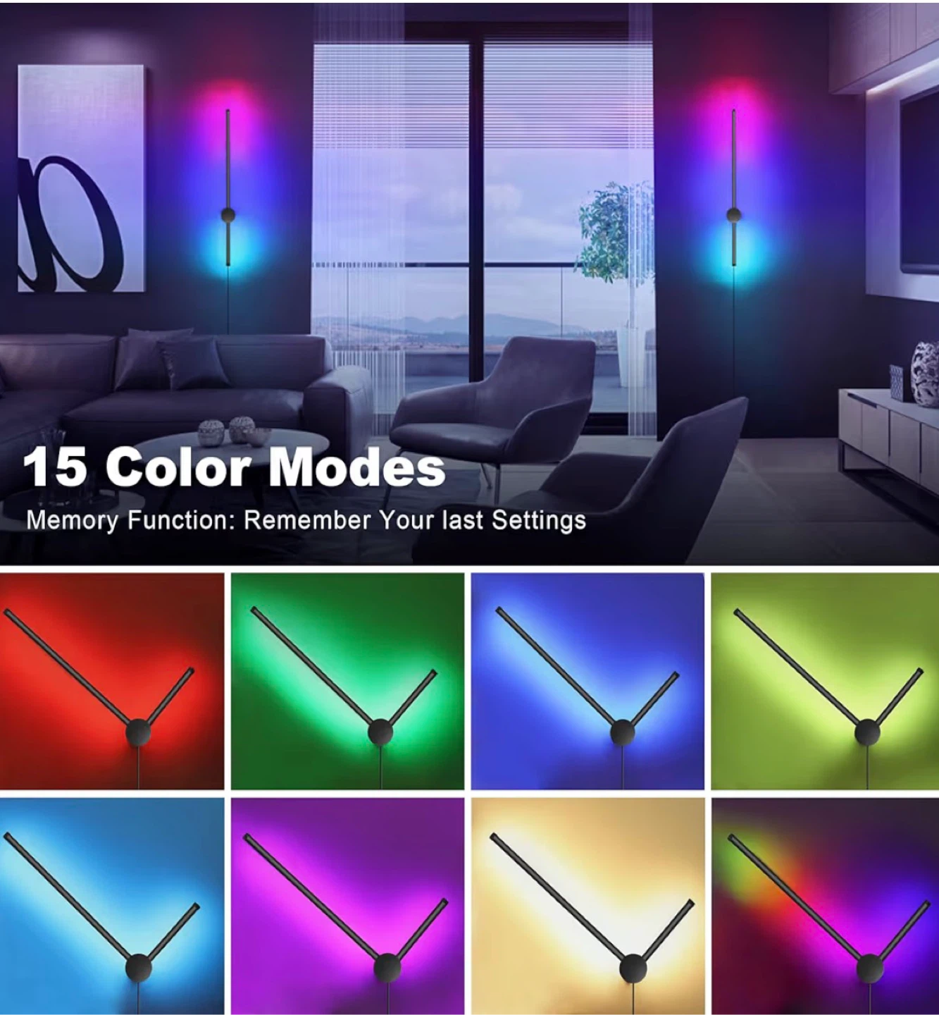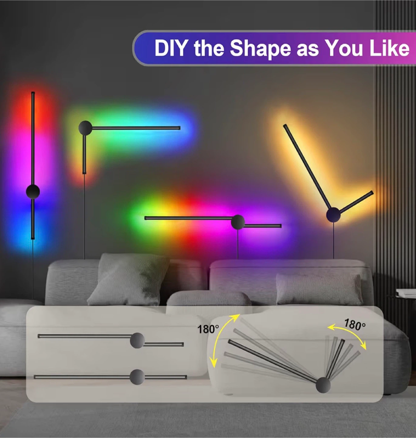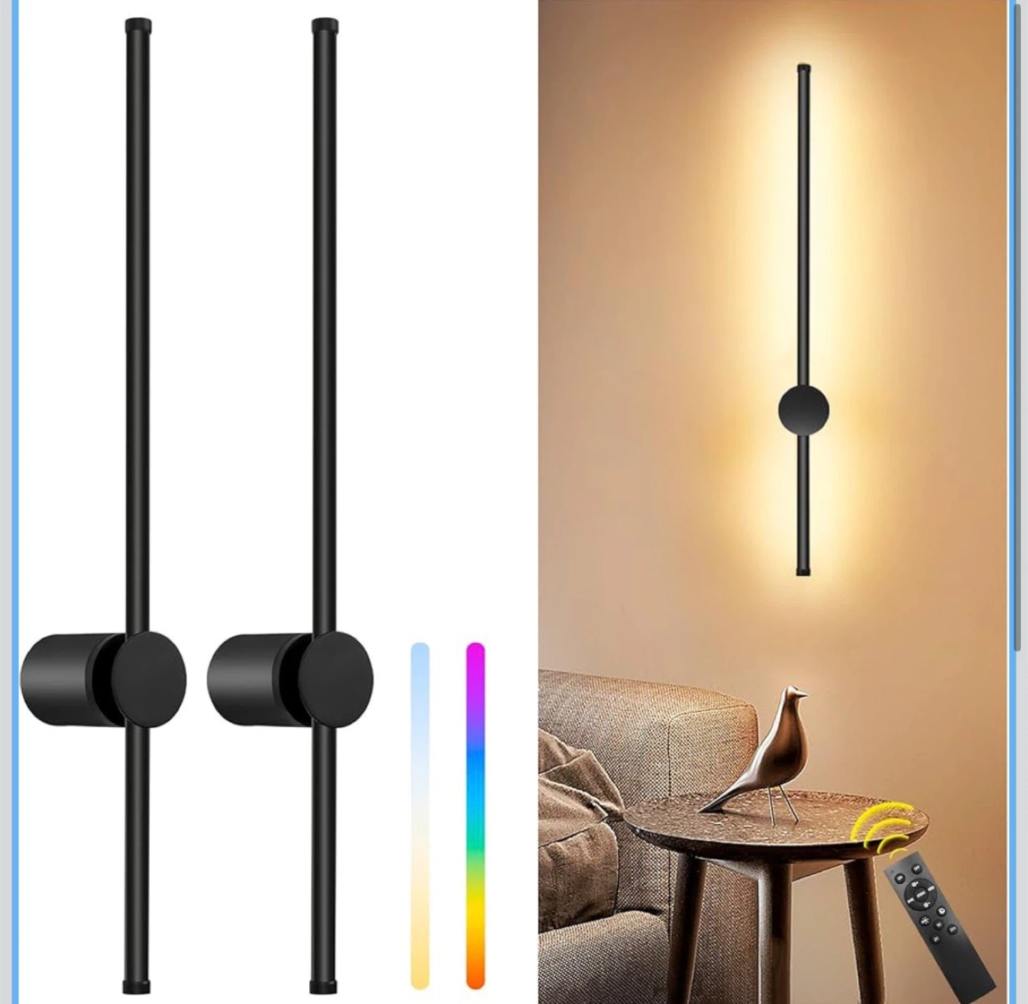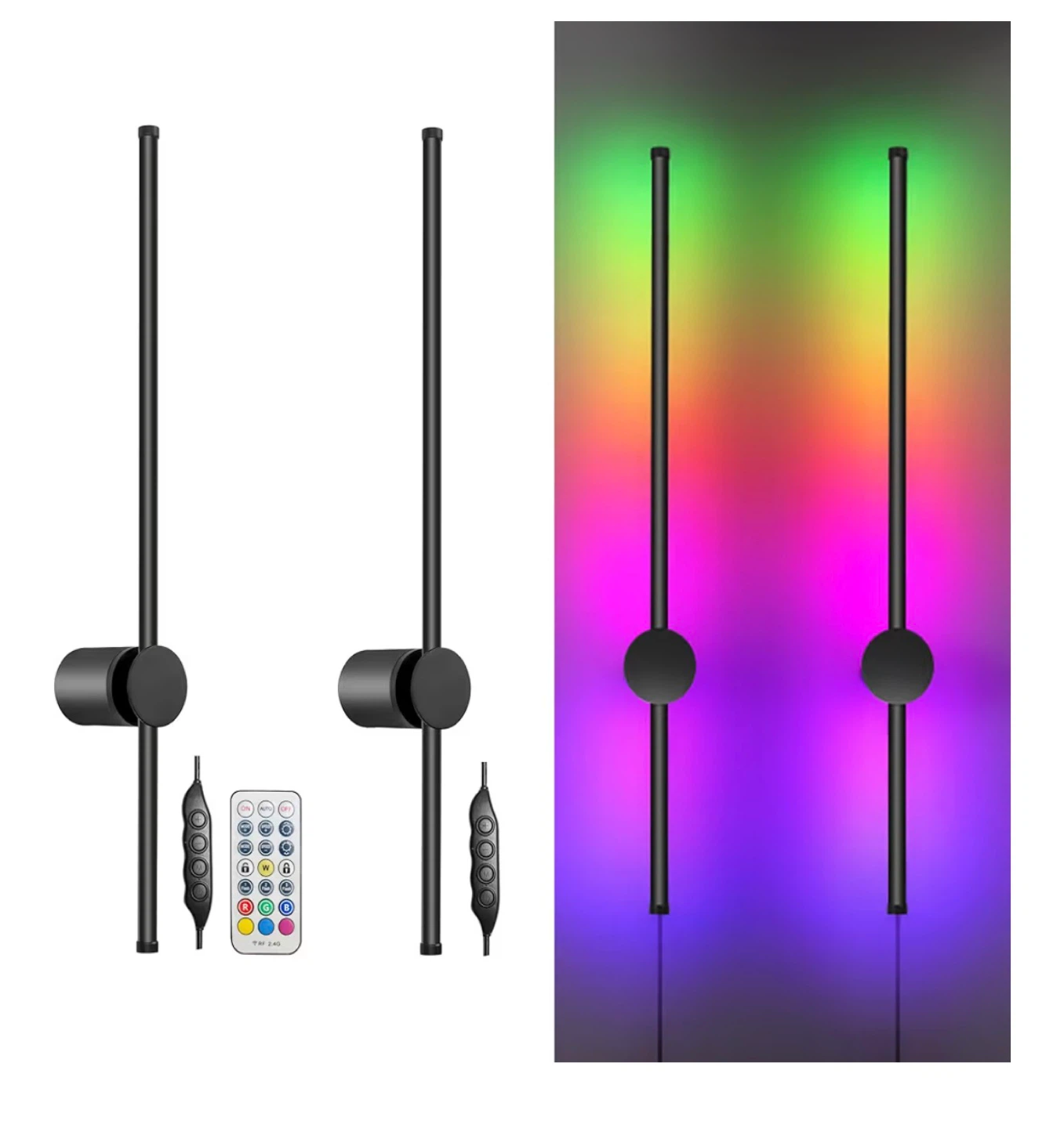 RGB LED Wall Sconces Set of Two with Remote, 15 Color Modes, Dimming, DIY 180° Rotate, Black Plug in Wall Sconces with Warm Light, Dynamic Multicolor Ambience Lights, Plug in Wall Light, 23.6 Inches