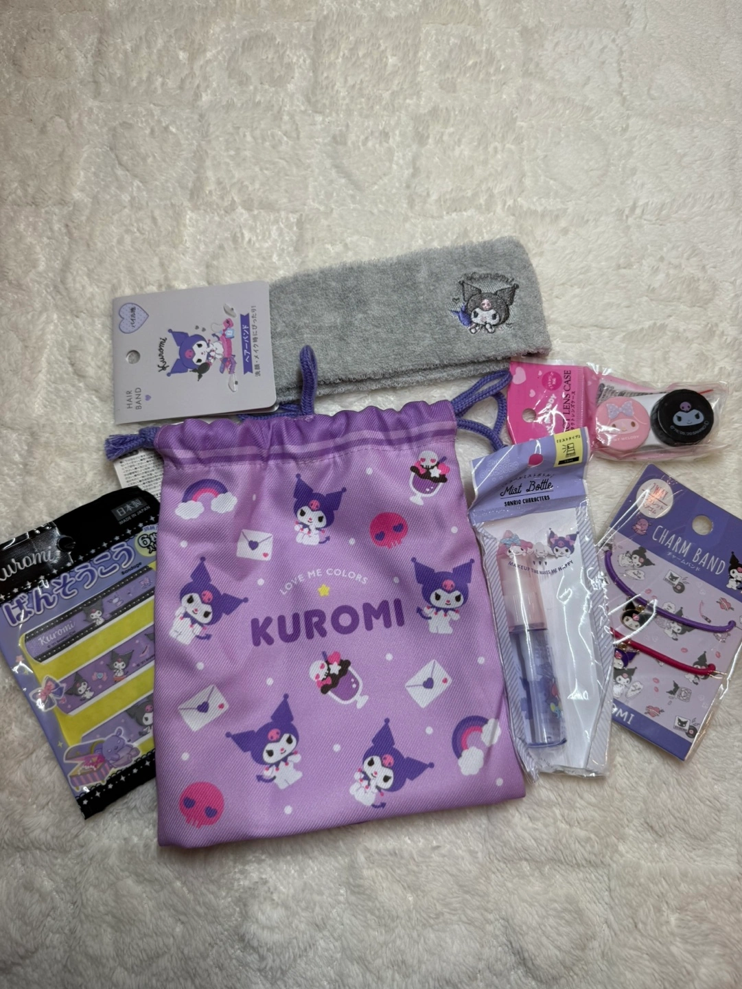 Adorable Kuromi-themed bundle. Includes drawstring bag, hairband, nail stickers, lip gloss, contact lens case, and charm bracelets. Perfect for fans!