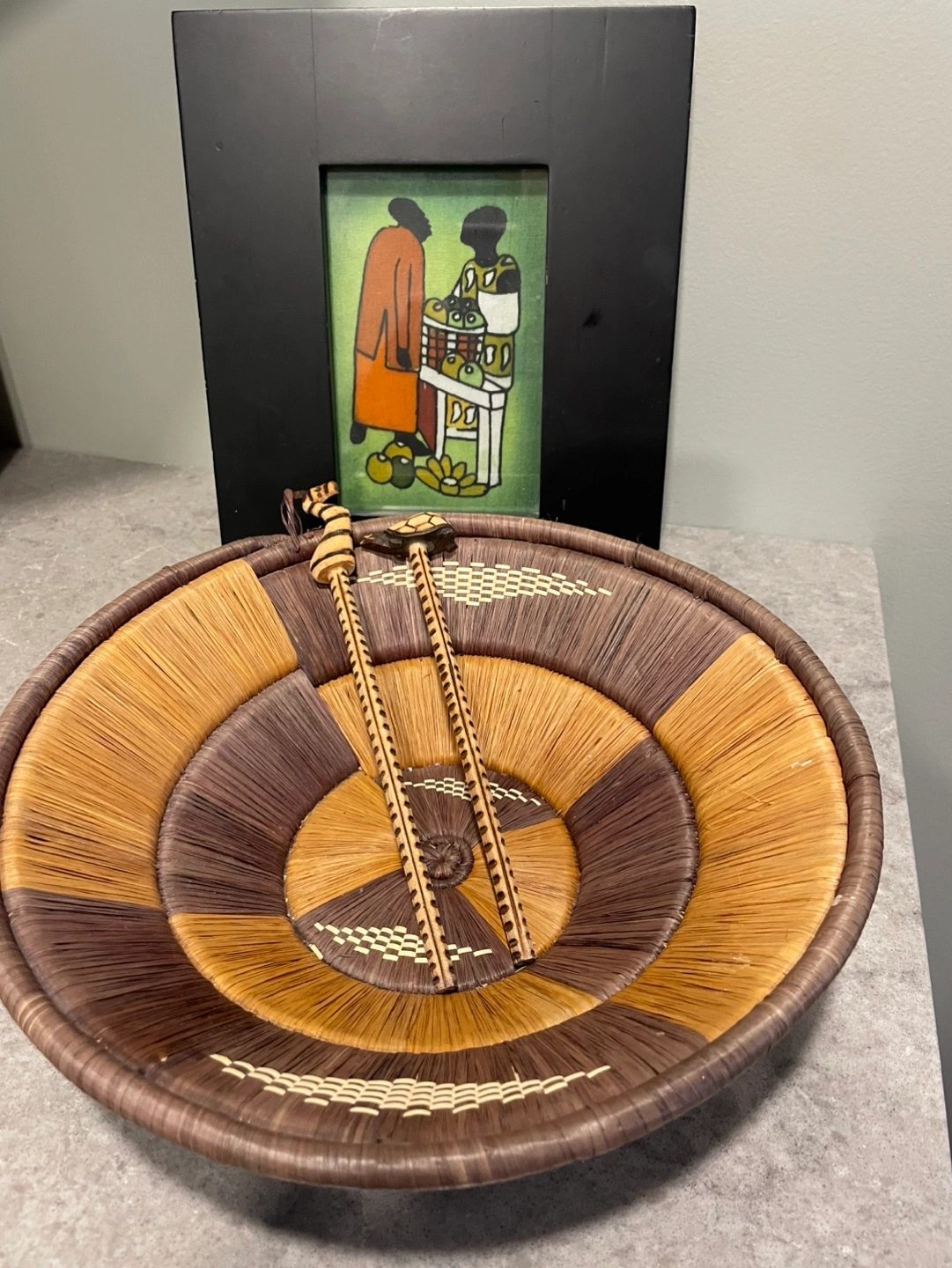Large, round woven bowl. Brown and tan colours. Two carved wooden pencils and framed fabric print picture included.
