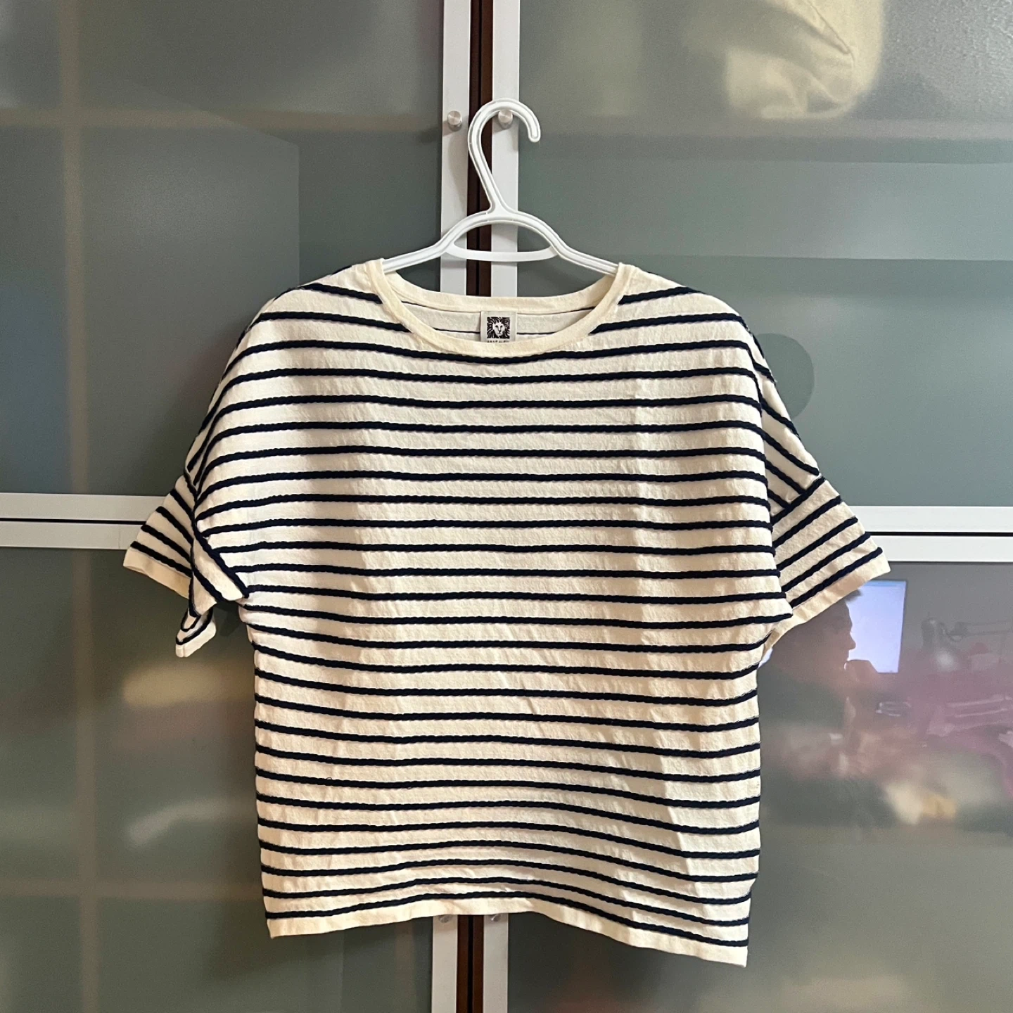 This is an Anne Klein striped t-shirt. It's a comfortable, classic piece for your wardrobe. Made with a soft fabric blend.