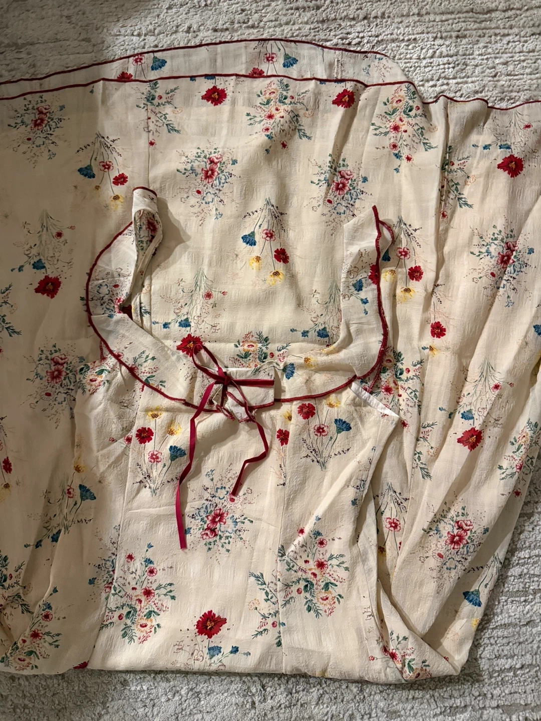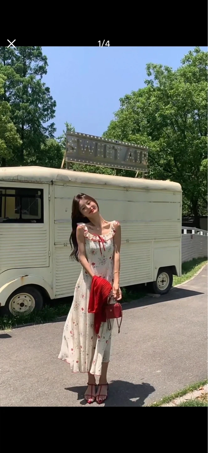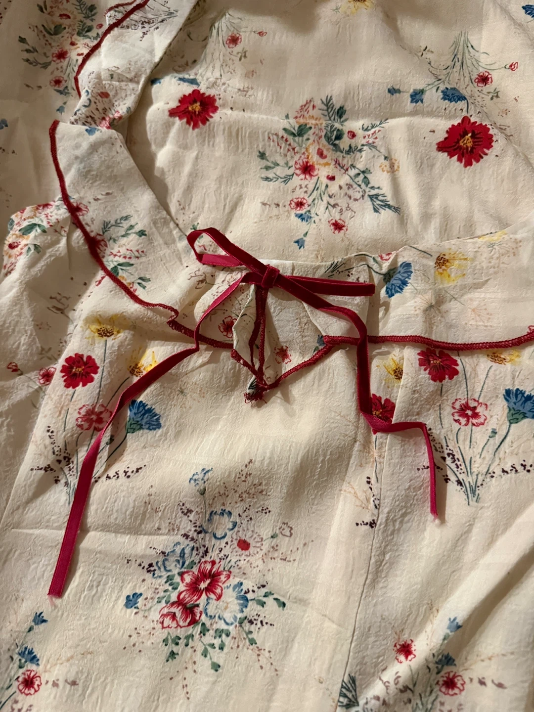 Cream midi dress with a delicate floral print and ruffled trim. It features a red velvet bow tie at the neckline. Lightweight fabric, perfect for warmer days! New with tag on and original package.