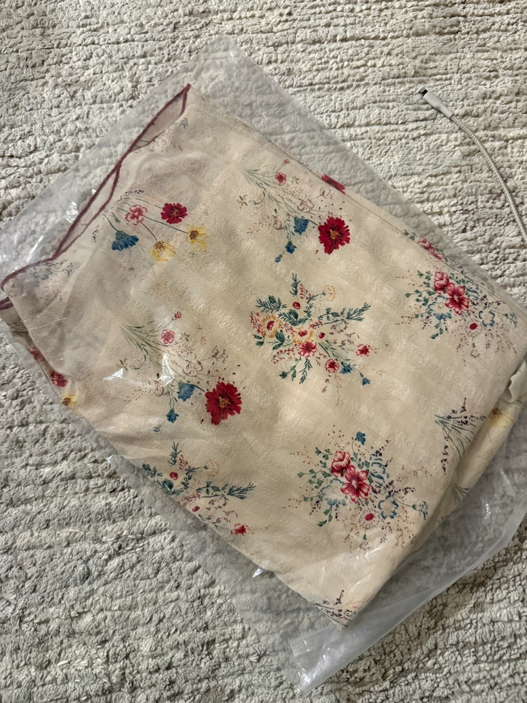 Cream midi dress with a delicate floral print and ruffled trim. It features a red velvet bow tie at the neckline. Lightweight fabric, perfect for warmer days! New with tag on and original package.