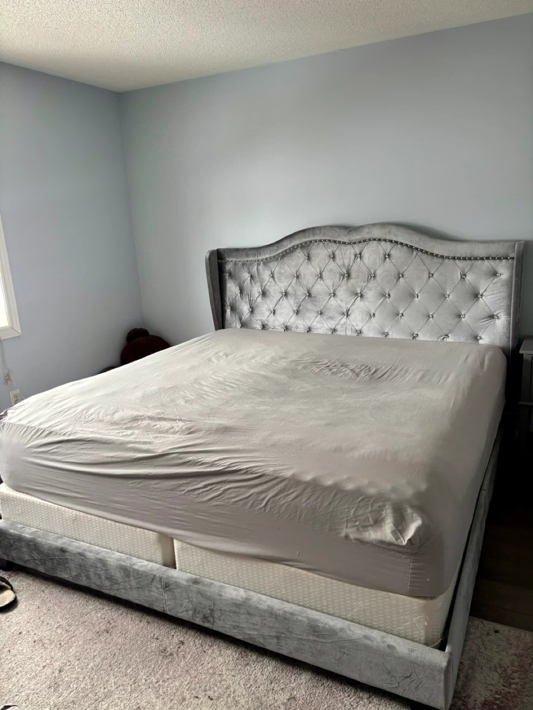 This is a grey velvet upholstered bed frame. It features a tufted wingback headboard with nailhead trim. Comes with box spring and memory foam top mattress.