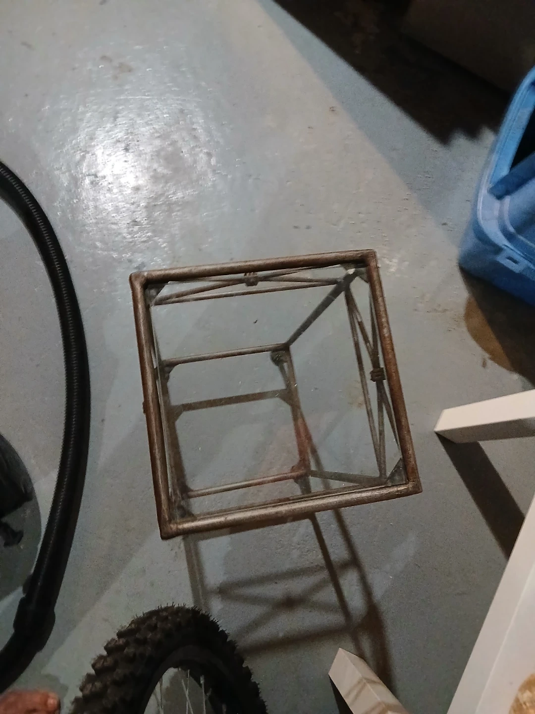 This is a square side table with a metal frame and glass top. It's approximately 18 inches tall. The metal has a bronze-like finish. Use it as a plant stand or for decorative items!