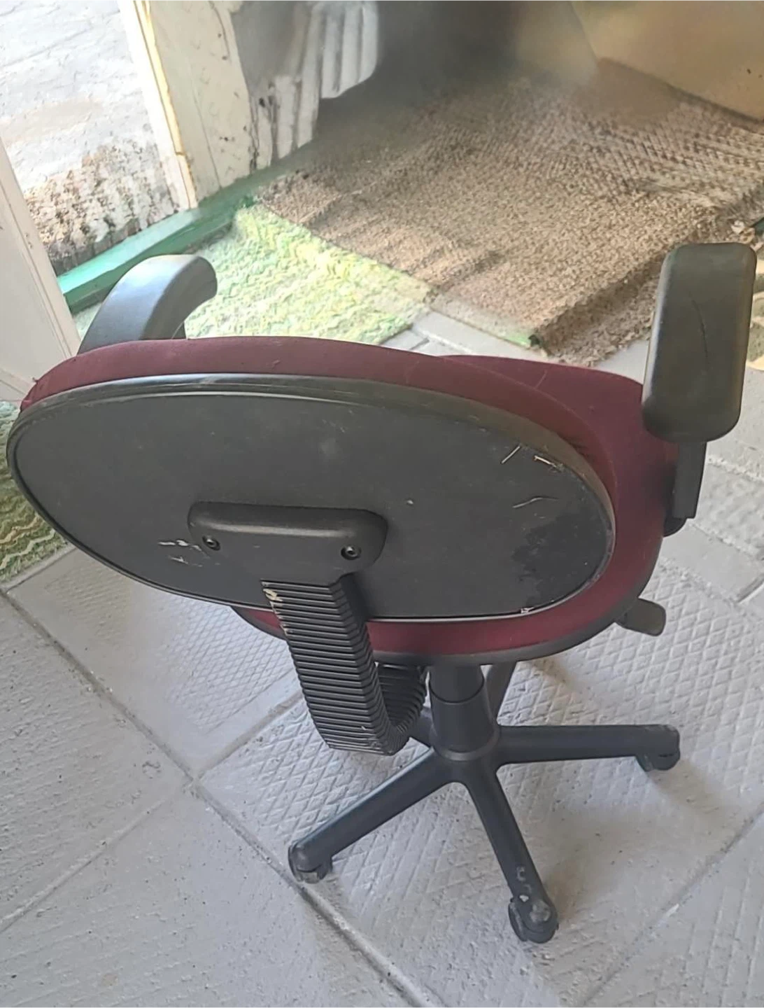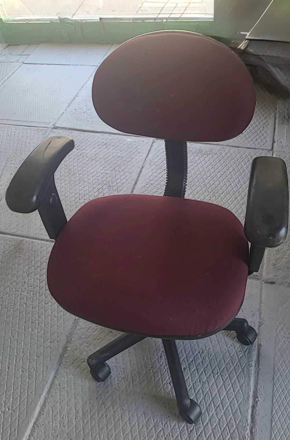 This is a burgundy office chair with adjustable armrests and a wheeled base. It's a comfortable seating option for a desk. The chair has a fabric upholstery.