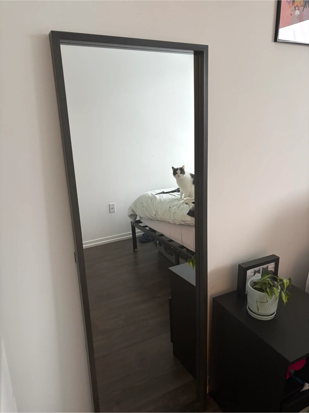 A full-length mirror with a dark grey frame. It's perfect for checking your outfit before heading out. The mirror's sleek design complements most decor styles.