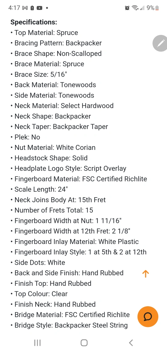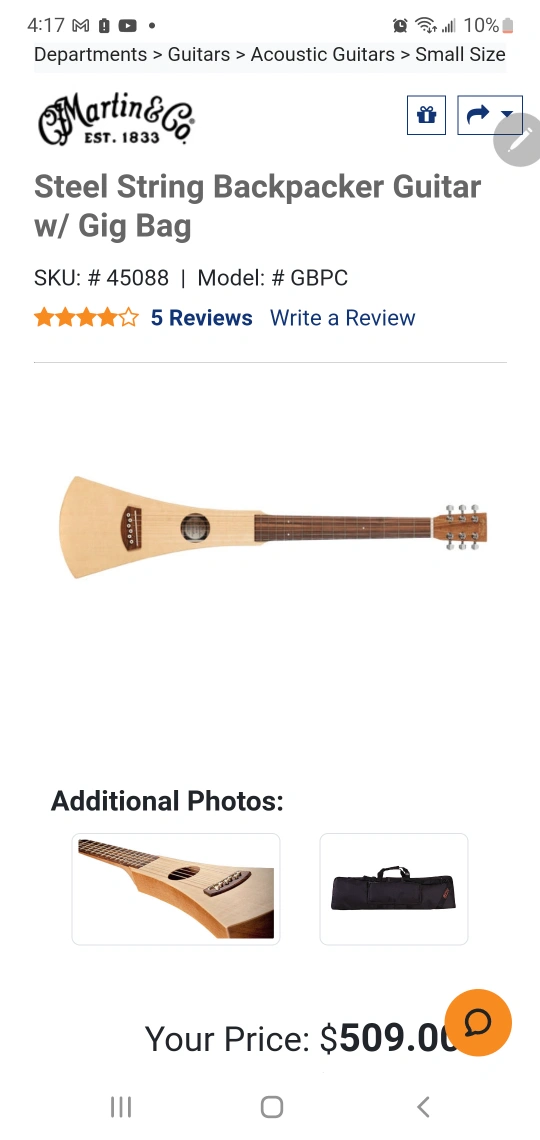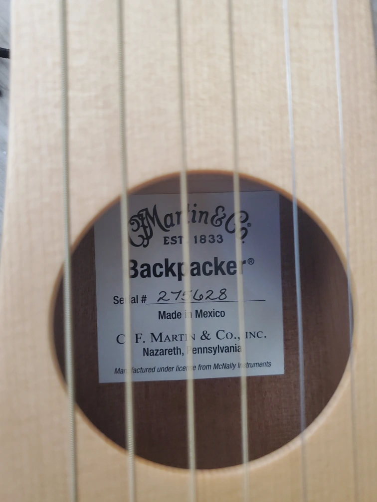 Pre-owned Martin & Co. Backpacker guitar. Includes gig bag. Excellent condition. Compact travel guitar, perfect for portability.