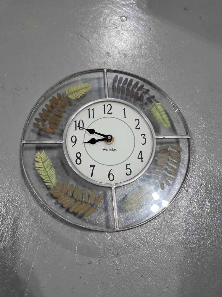 Selling a Westclox round wall clock. It features a clear face with a leaf design around the perimeter. It's a nice decorative piece for any room!