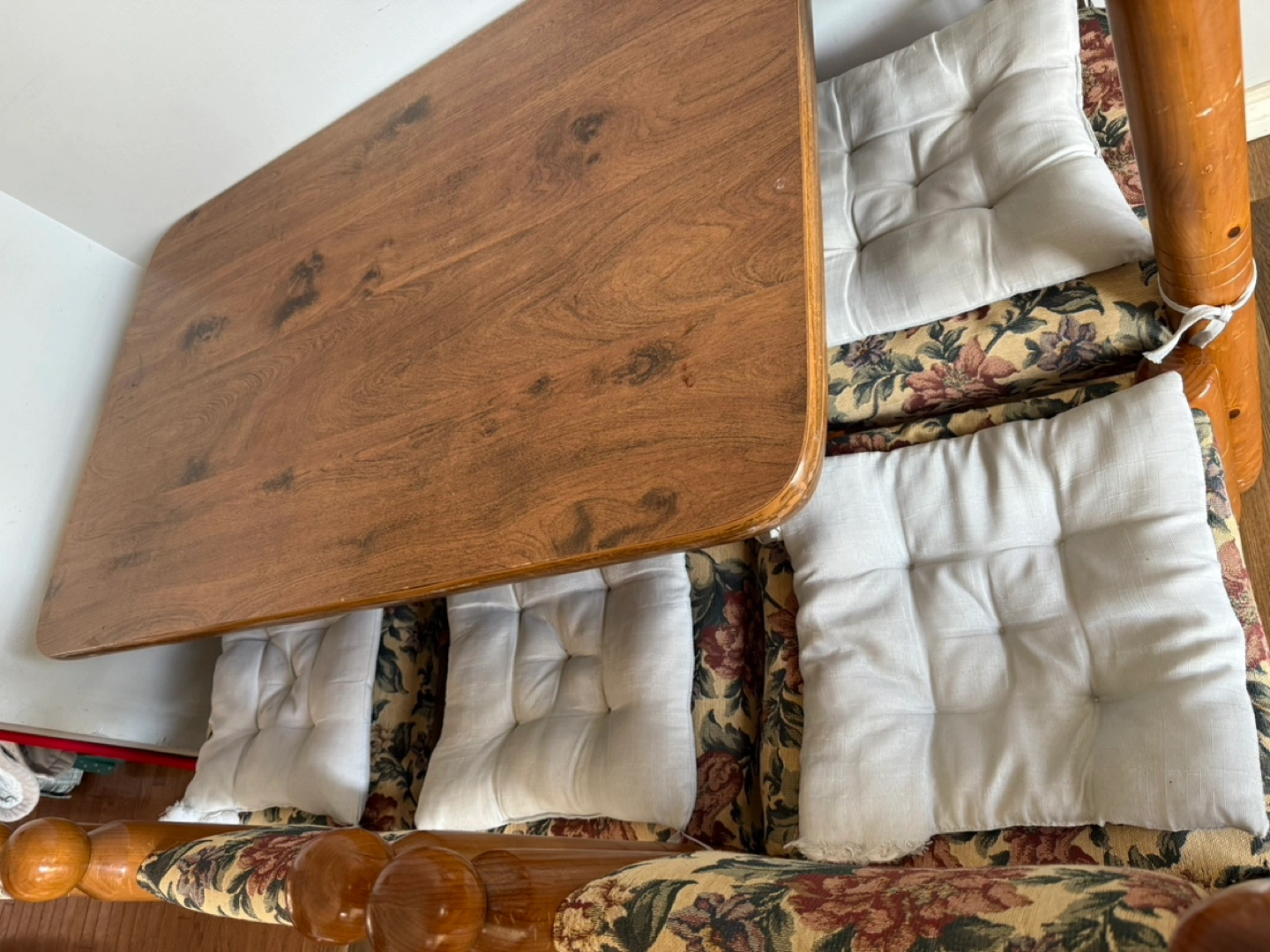 Four chairs and a small table. Wooden construction. Floral patterned chair cushions. Some wear and tear visible.