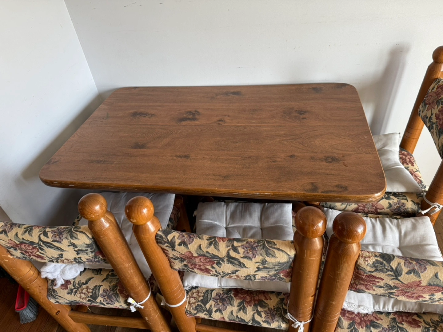 Four chairs and a small table. Wooden construction. Floral patterned chair cushions. Some wear and tear visible.
