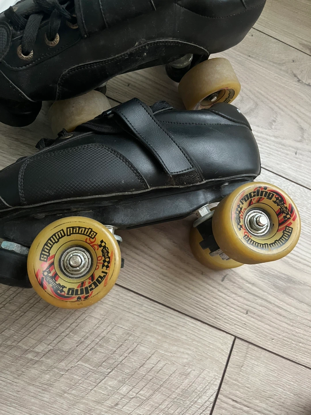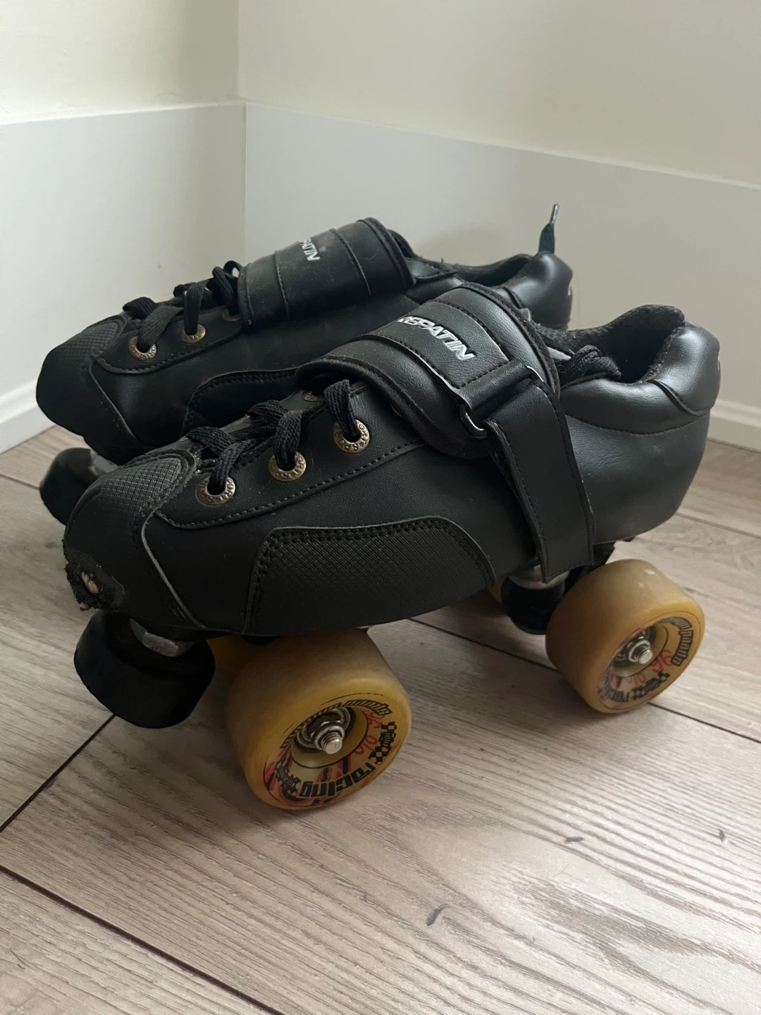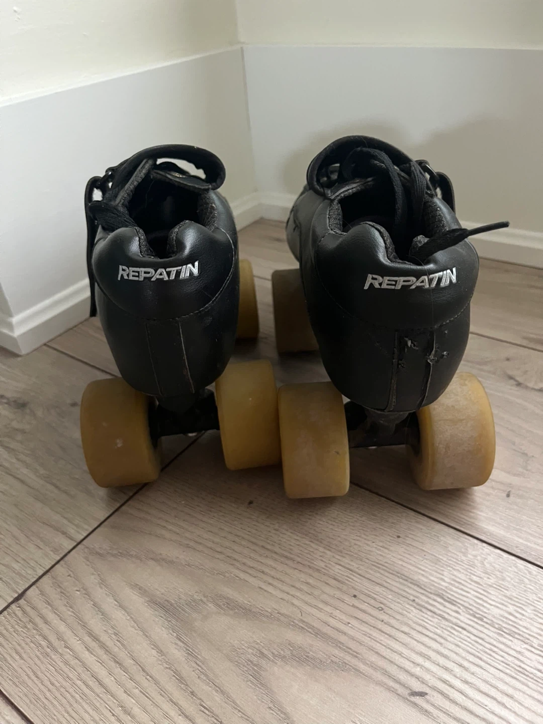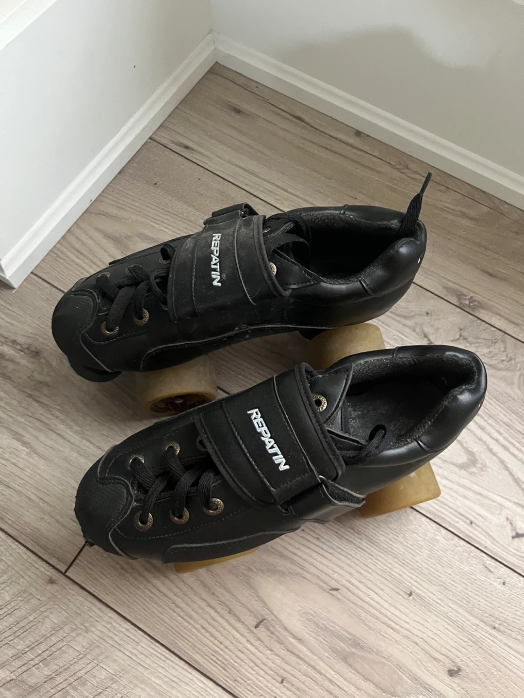 These REPATIN Derby/roller skates are black with lace-up closures and velcro straps. They have yellowed wheels attached.
