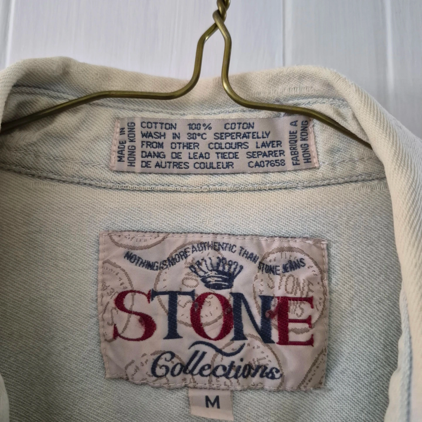 Light wash denim long-sleeve shirt from Stone Collections. It's a size medium with two chest pockets. Sleeve cuff is torn, showing wear.